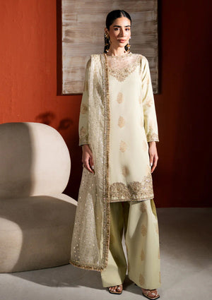 Outfit Type: Eastern Style: Gharara Color Type: Yellow Package Includes: 3 Piece Top , Bottom & Dupatta Fabric: Shirt: Net Trouser: Jamawaar Dupatta: Chiffon Work Technique: Embroidered Best worn in: All Season Description: Shirt: Embroidered Khaadi Net Front (2)Embellished + Embroidered Organza NecklineEmbroidered Organza Neckline FinishingEmbroidered Khaadi Net...Formals - Aik Atelier - Volume 1 - Festive 25 - Look 08