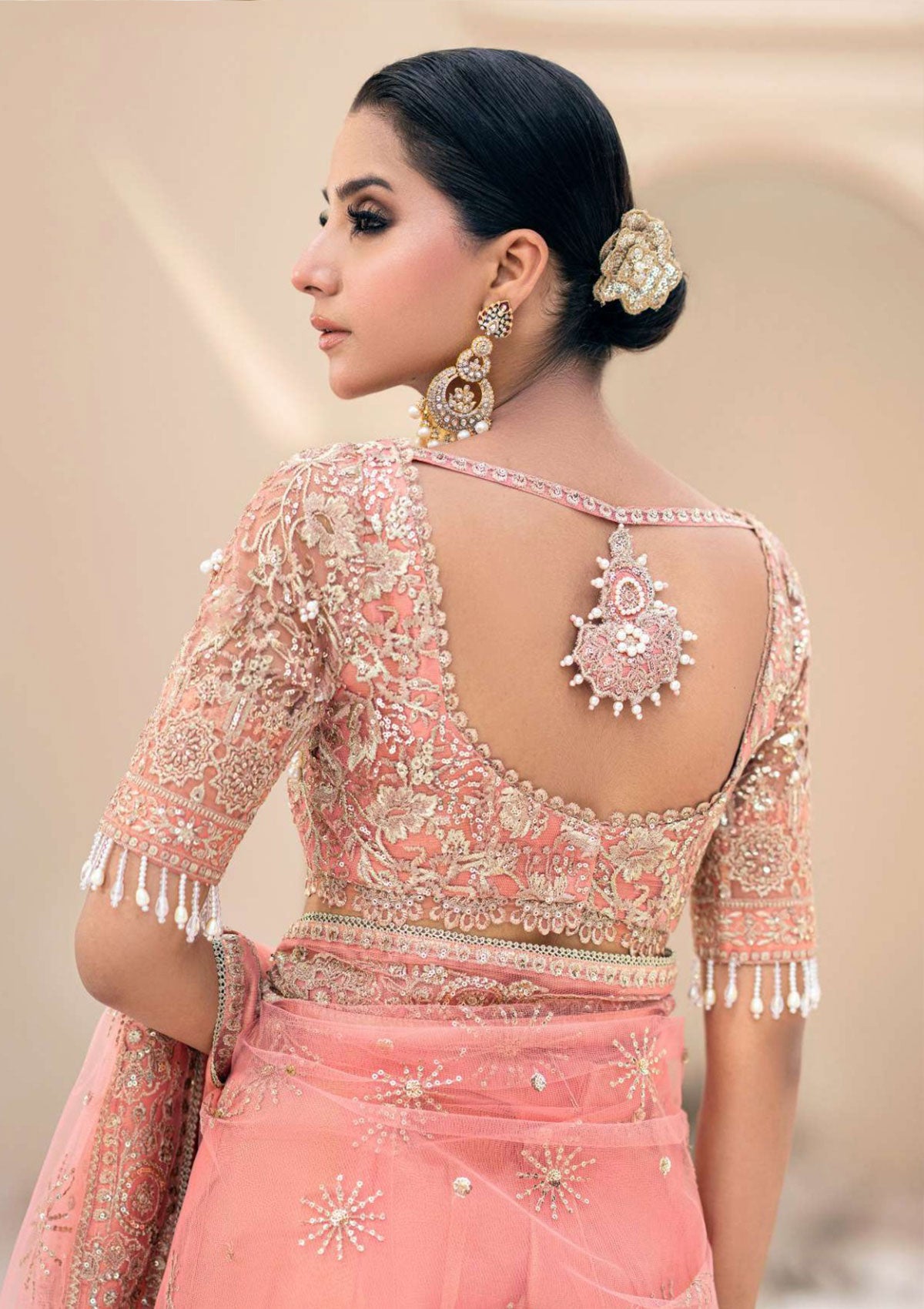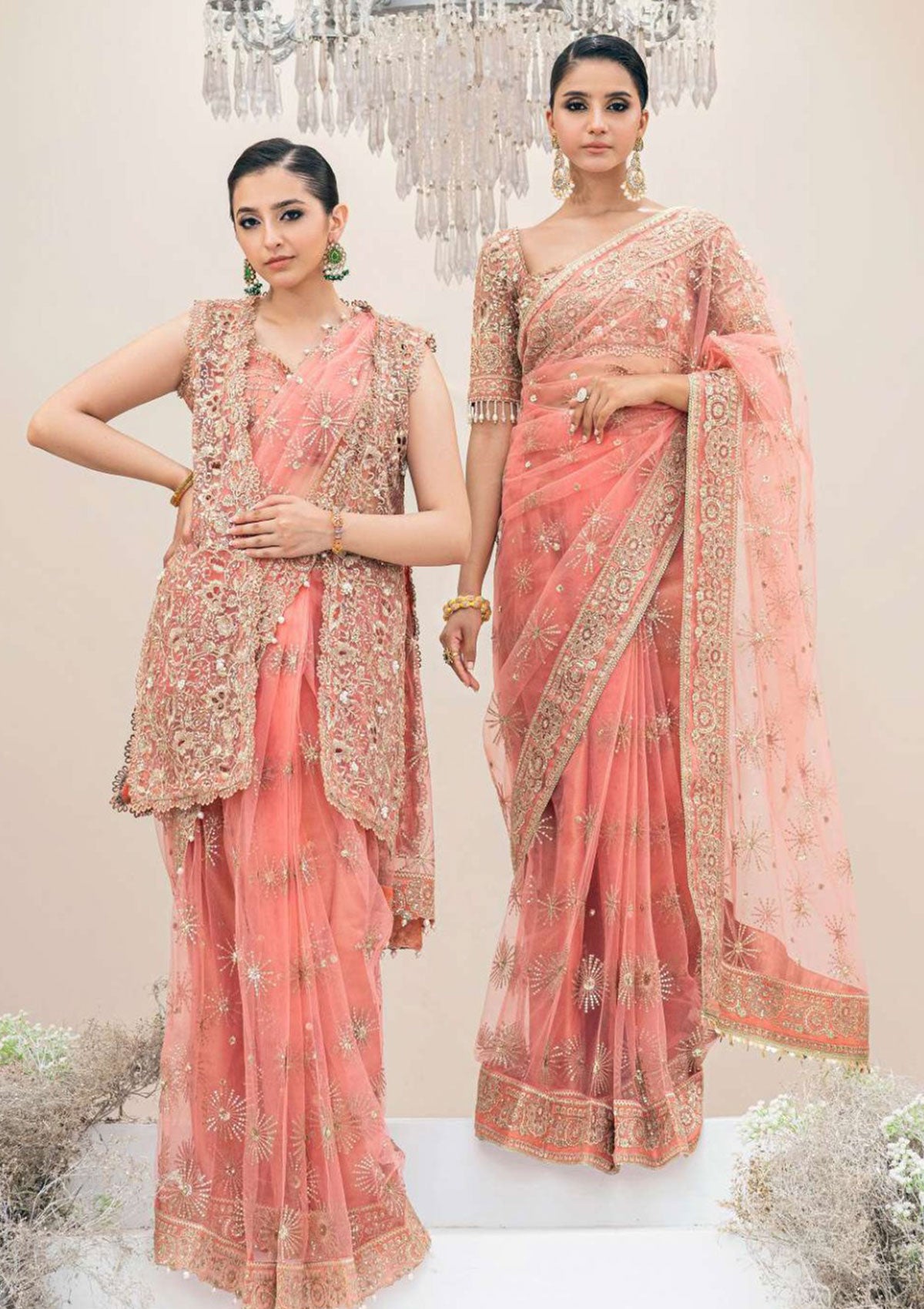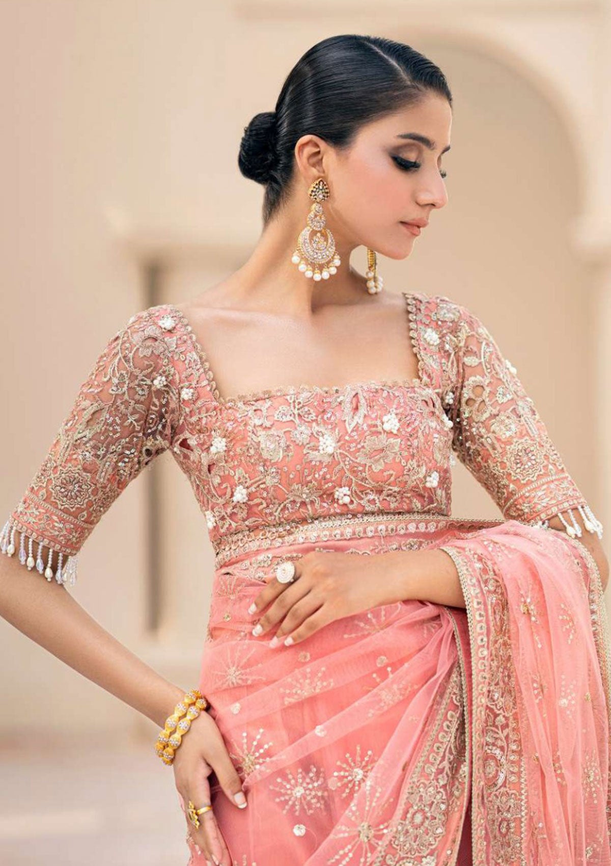 Reminiscent of blooming petals, this Saree celebrates femininity with its meticulous attention to detail. On a canvas of coral tulle, the sequins sway across the fabric, creating a mystical enchantment while the tilla embroidery graces the borders, giving dimension to the Look. An ode to the romanticized French era, this Look exudes elegance with every drape.