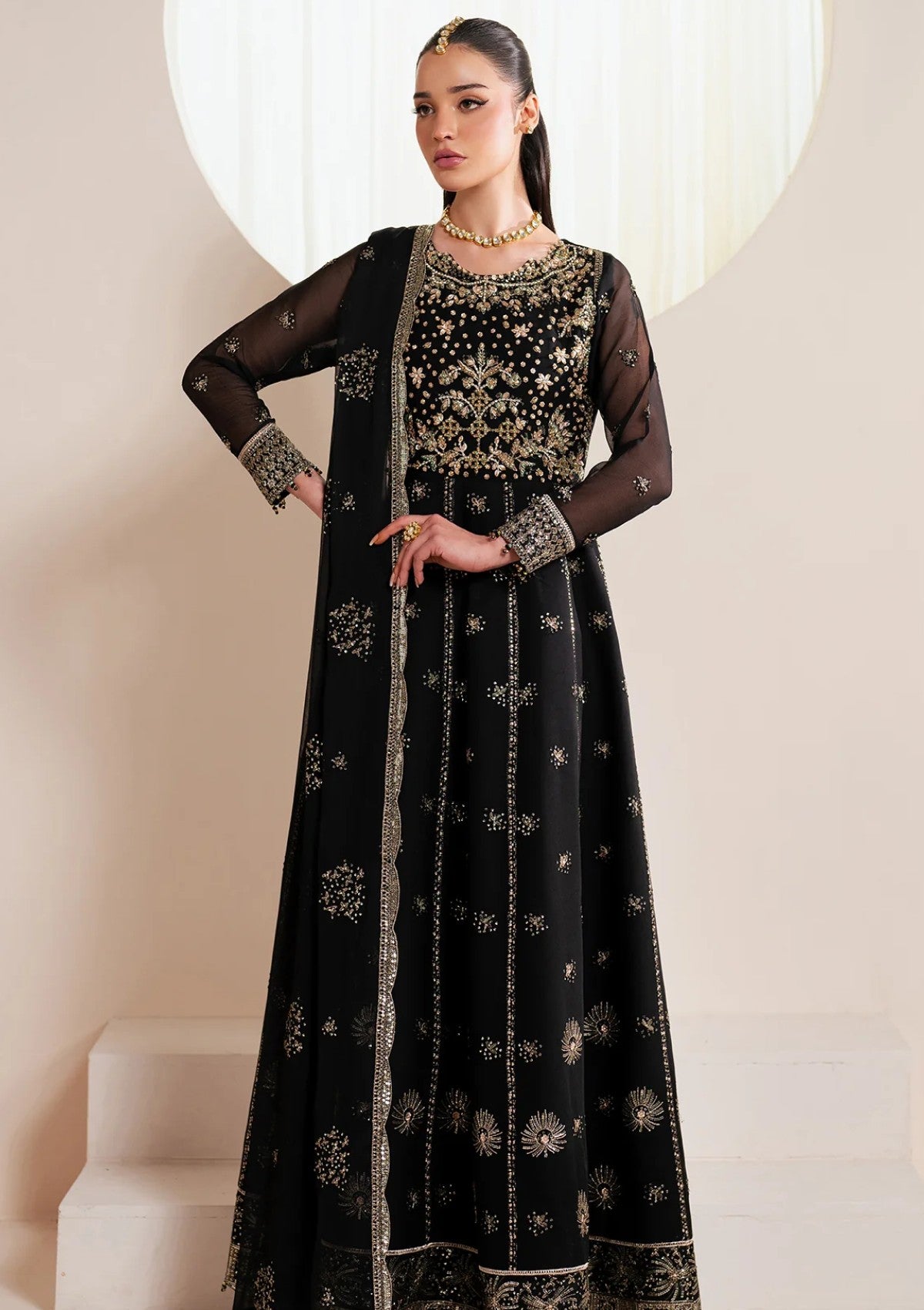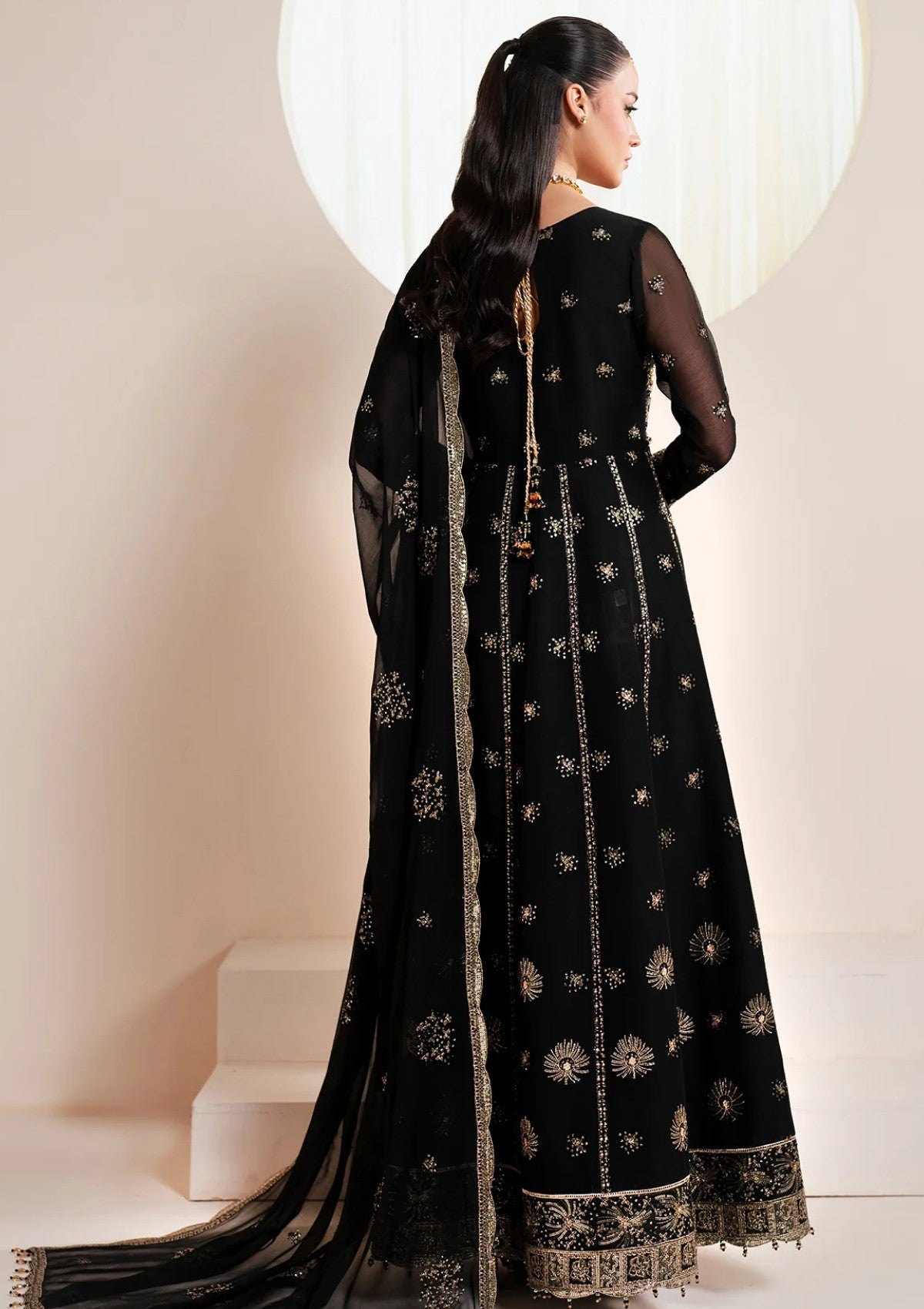 The "Noir" is an elegant black chiffon maxi ensemble, beautifully crafted with intricate handwork and delicate embroidery patterns. It is paired with Russian grip trouser and an embroidered chiffon dupatta, creating a sophisticated and refined look and ideal for special occasions.