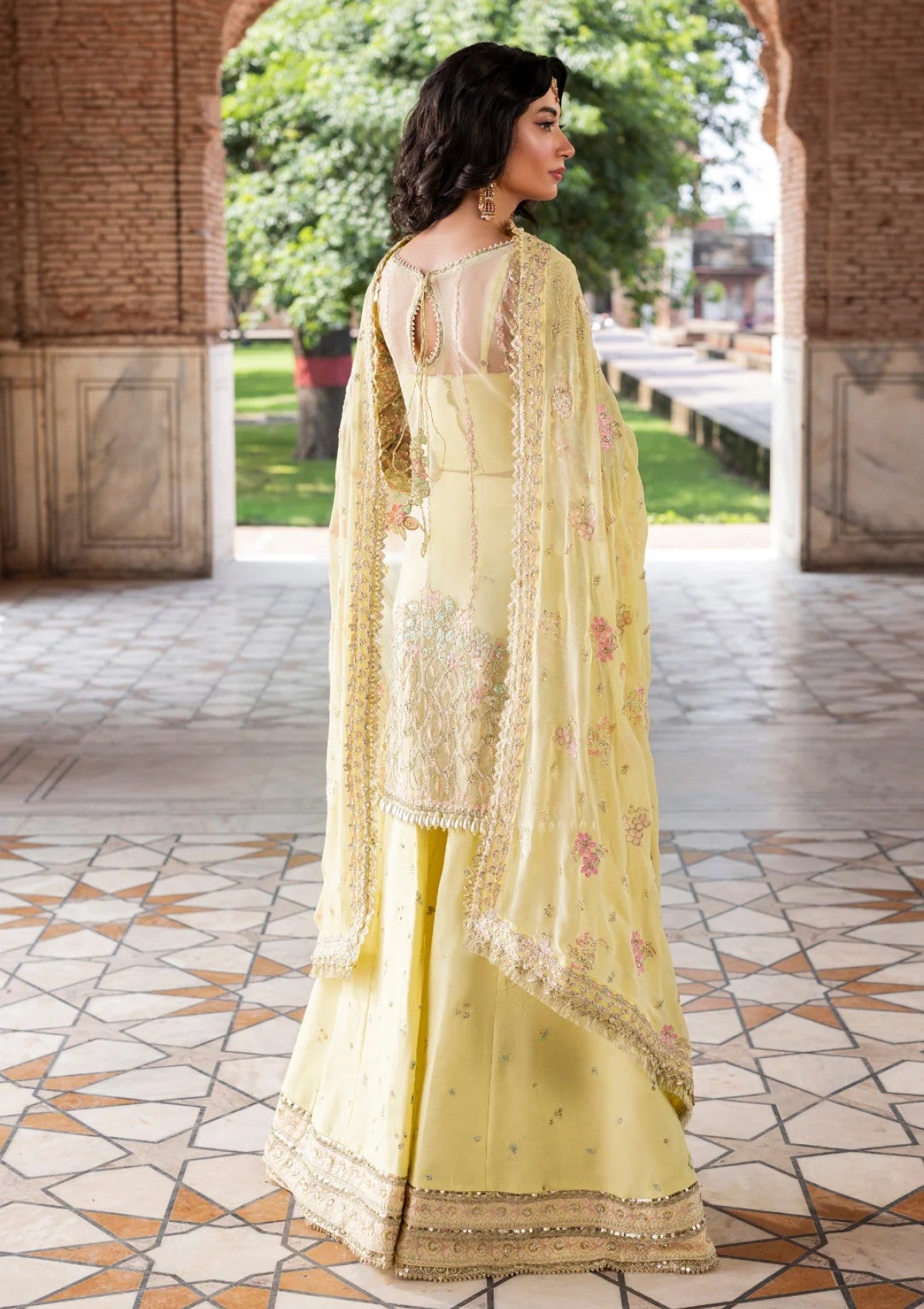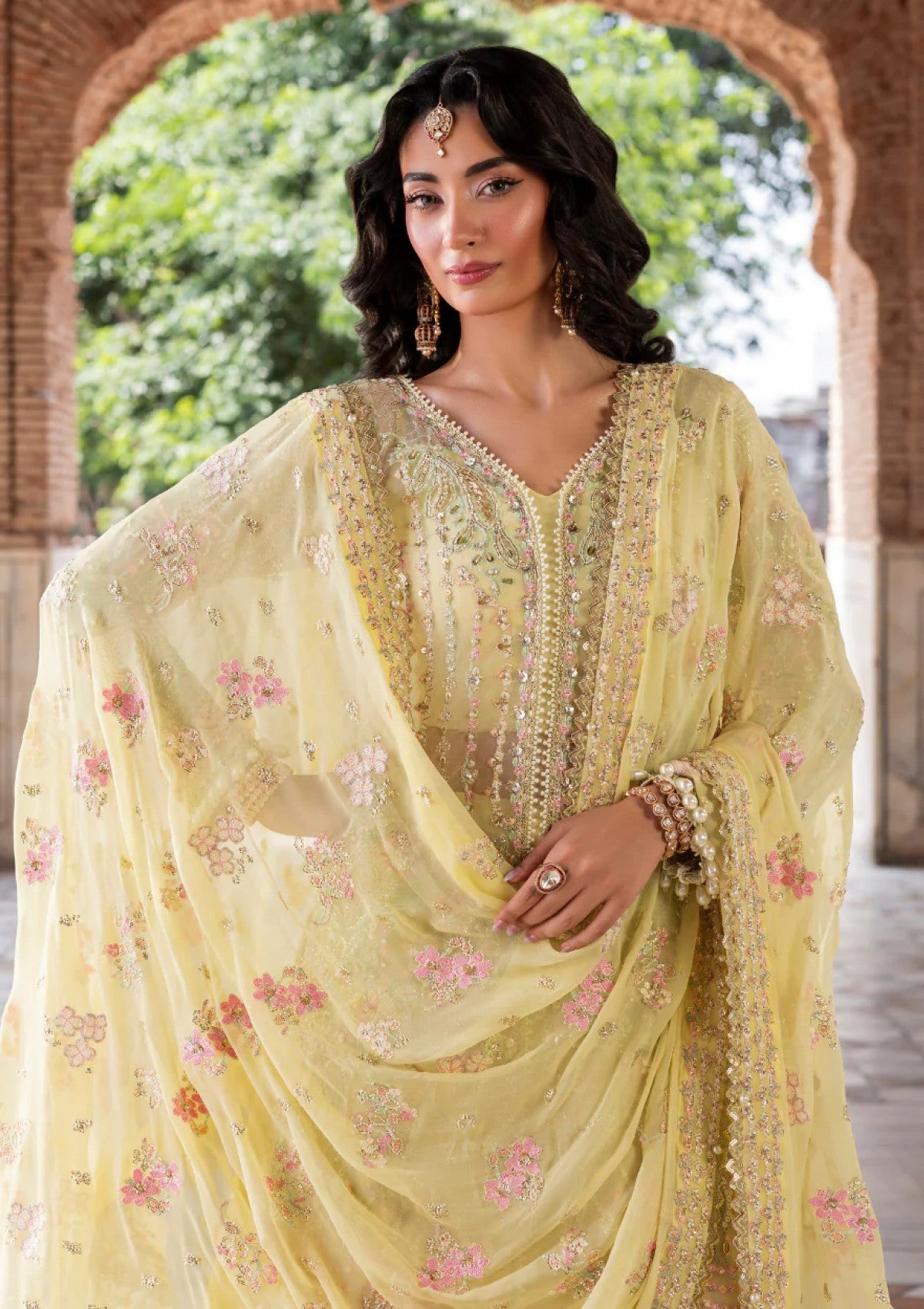 Graceful and radiant, Lumena from the Ember Collection features a pale yellow long shirt crafted on organza, richly hand-embellished with intricate detailing on the panels and sleeves. The look is completed with a delicately embroidered chiffon dupatta and an embroidered raw silk trouser, creating a timeless expression of elegance and festive sophistication.