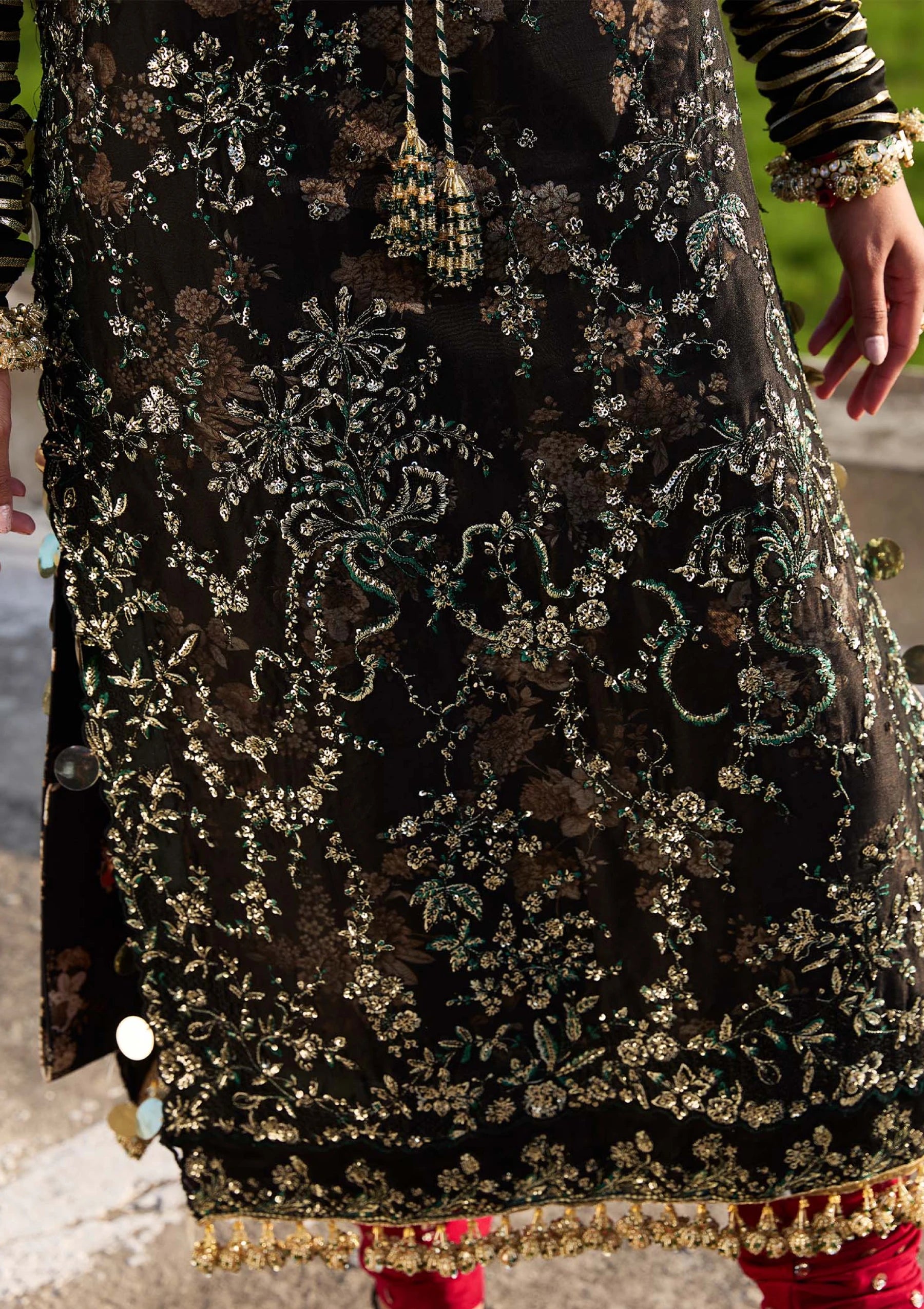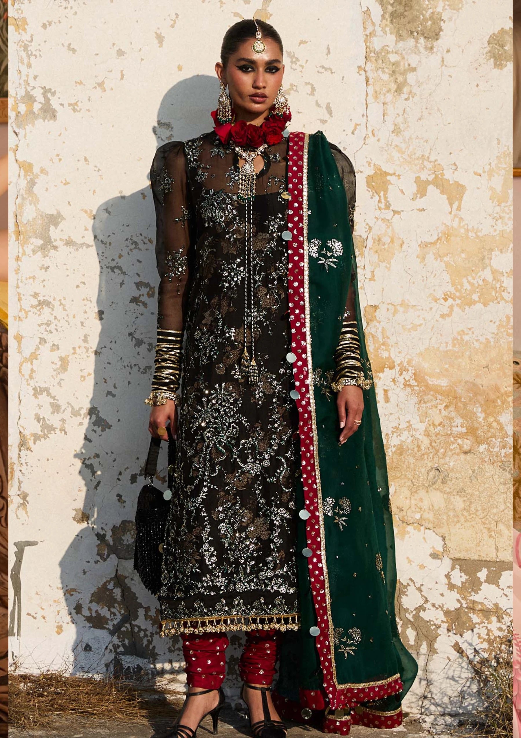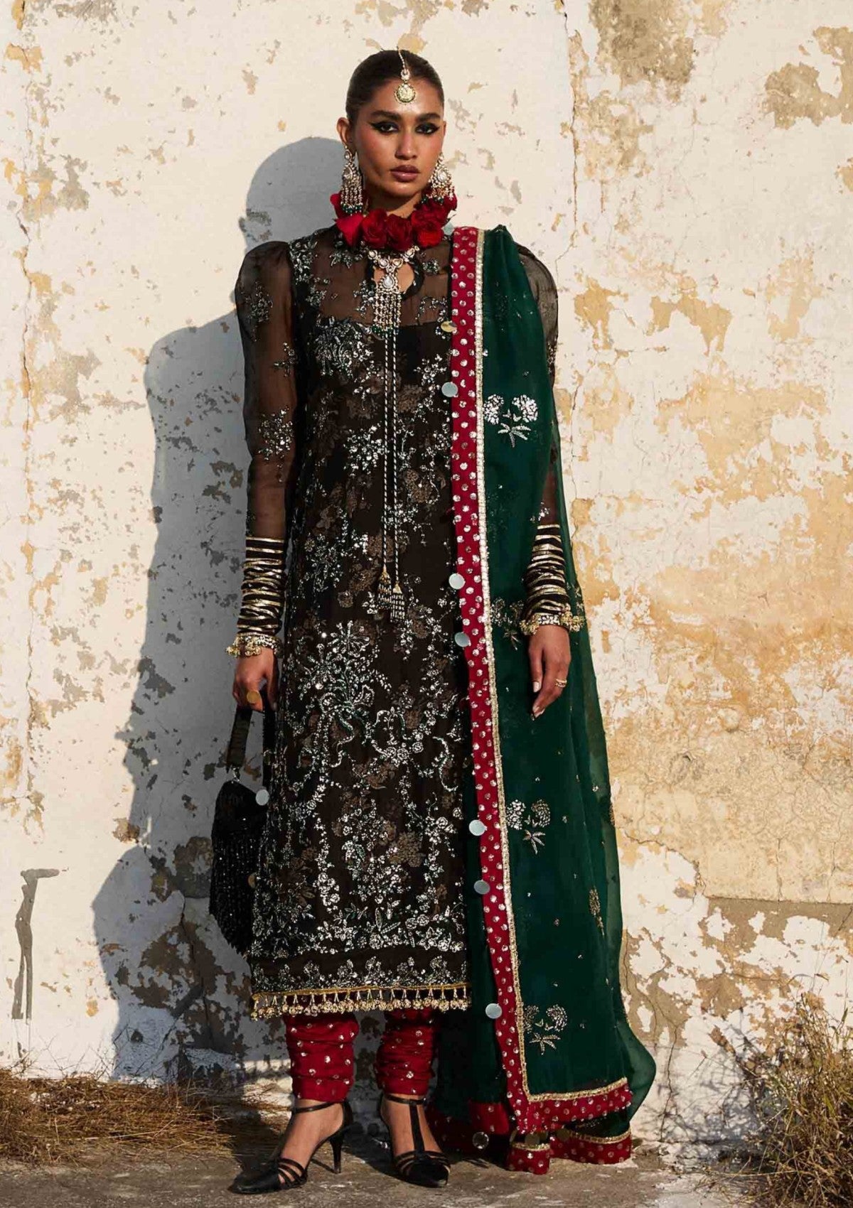 The formal outfit features an embroidered organza long shirt, lending it an ethnic look. The churidar is made of maroon embroidered Korean raw silk, giving it a traditional touch. The organza dupatta boasts beautiful designs and is complemented by sequins-embroidered borders. This outfit is a perfect blend of traditional and contemporary elements