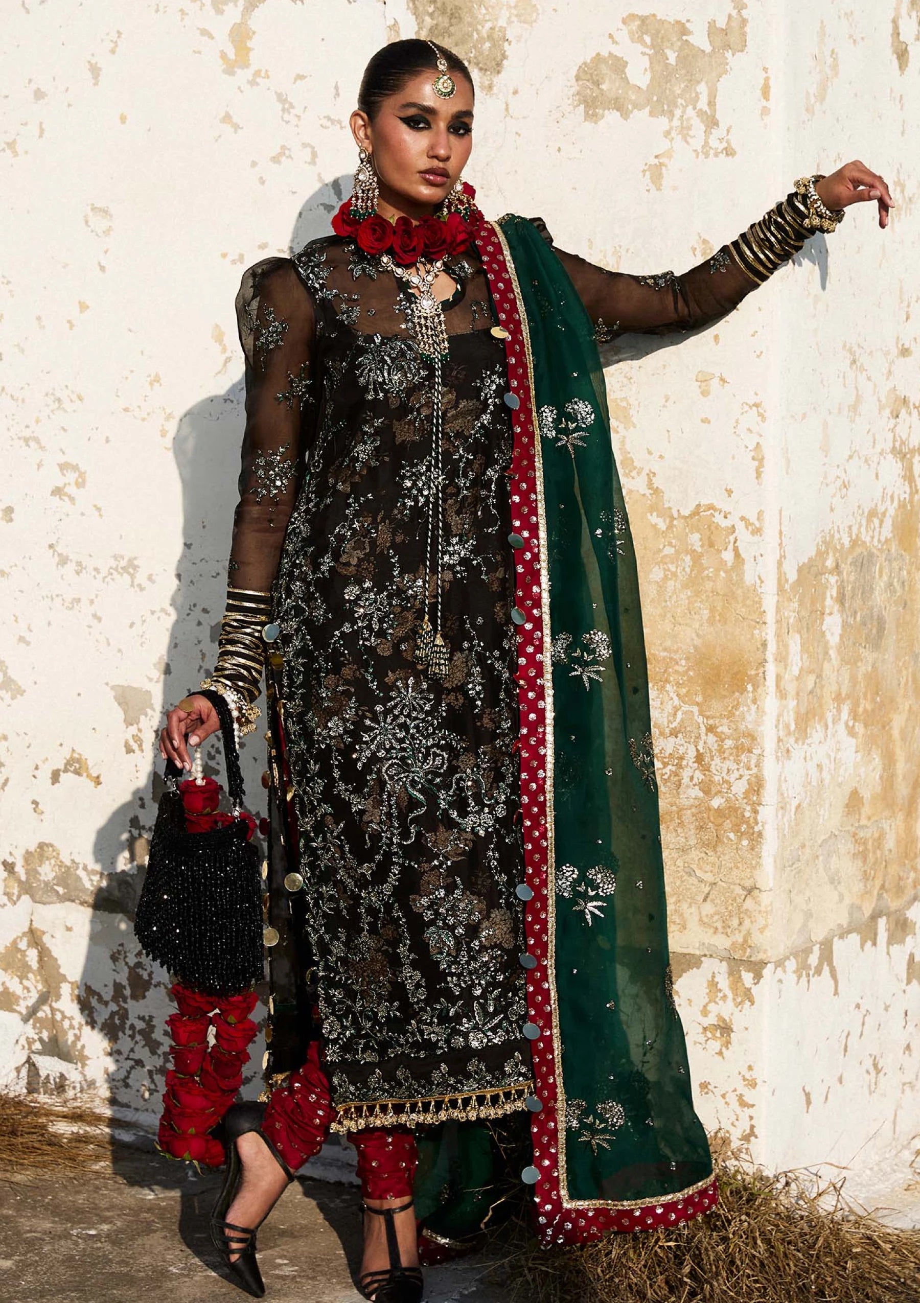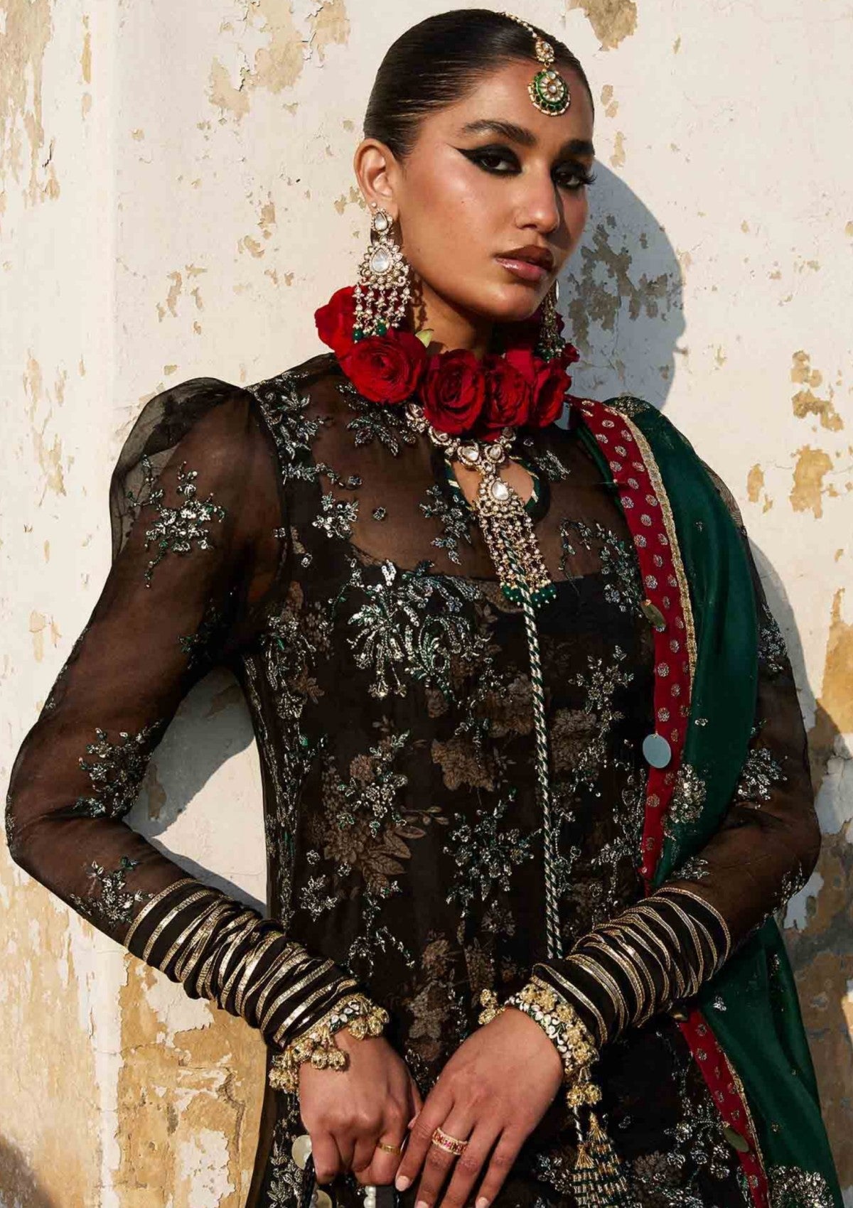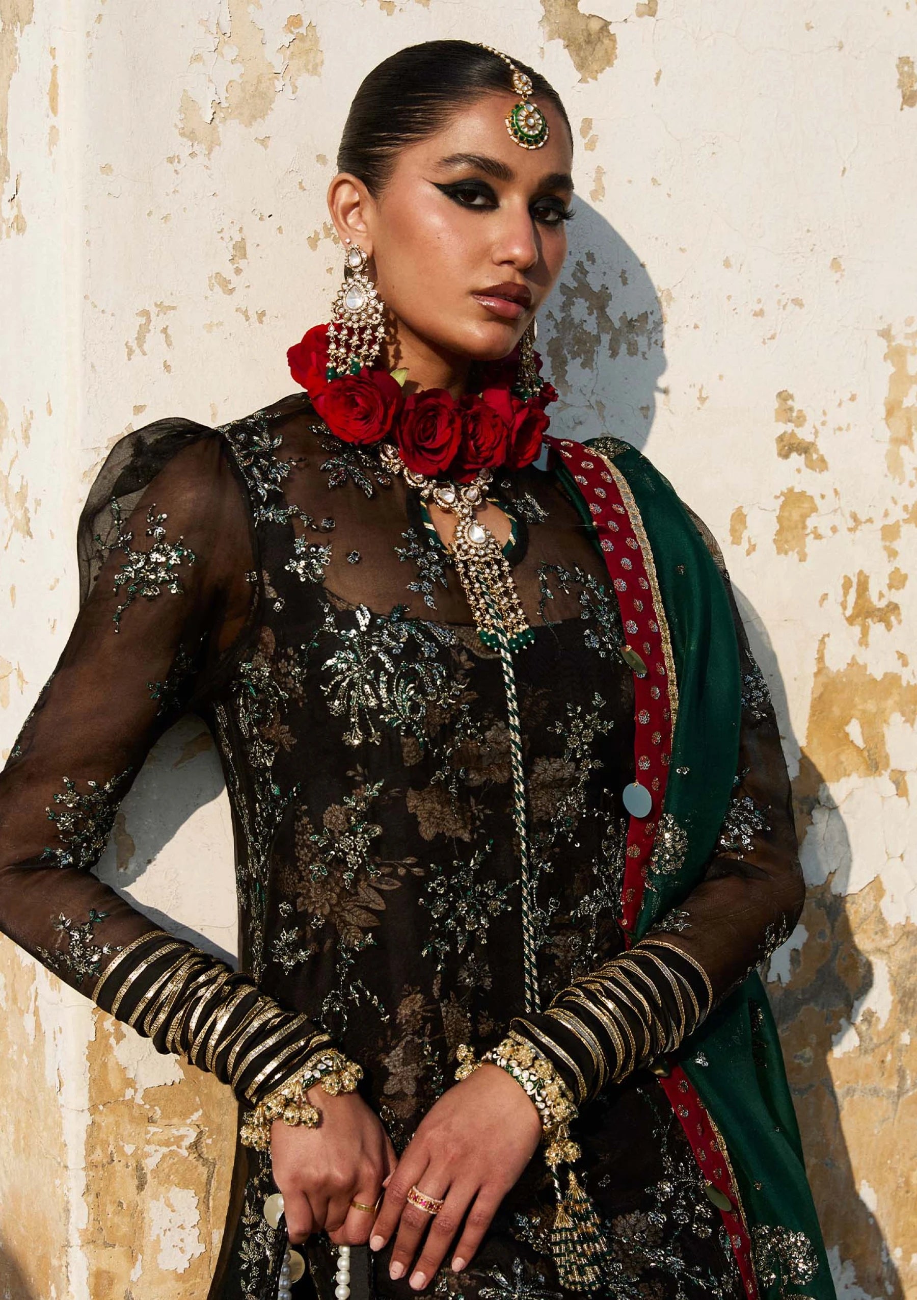 The formal outfit features an embroidered organza long shirt, lending it an ethnic look. The churidar is made of maroon embroidered Korean raw silk, giving it a traditional touch. The organza dupatta boasts beautiful designs and is complemented by sequins-embroidered borders. This outfit is a perfect blend of traditional and contemporary elements