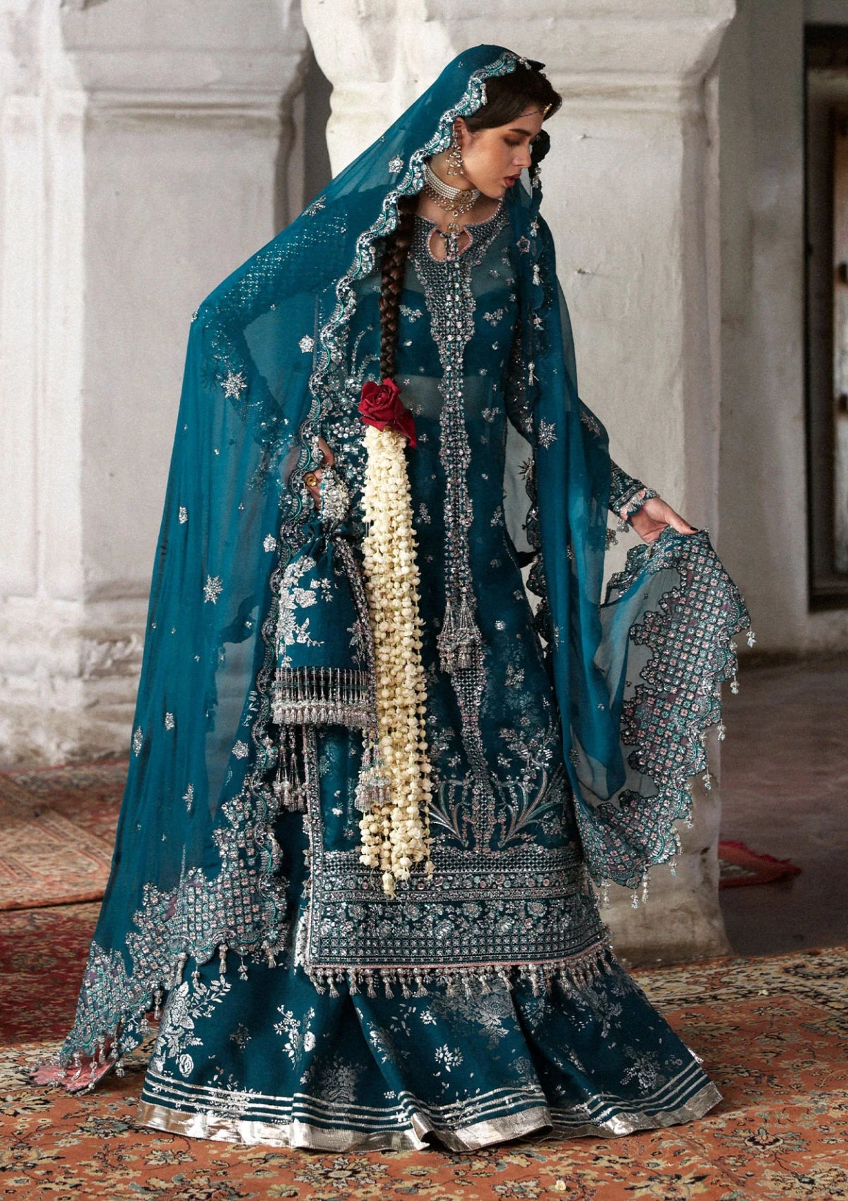 The teal organza shirt is beautifully crafted with intricate embroidery on both front and back panels, enhanced with embroidered borders. The screen printed Korean raw silk sharara adds a graceful and traditional appeal, while the embroidered dupatta with borders completes the look with elegance. This outfit is perfect for festive occasions