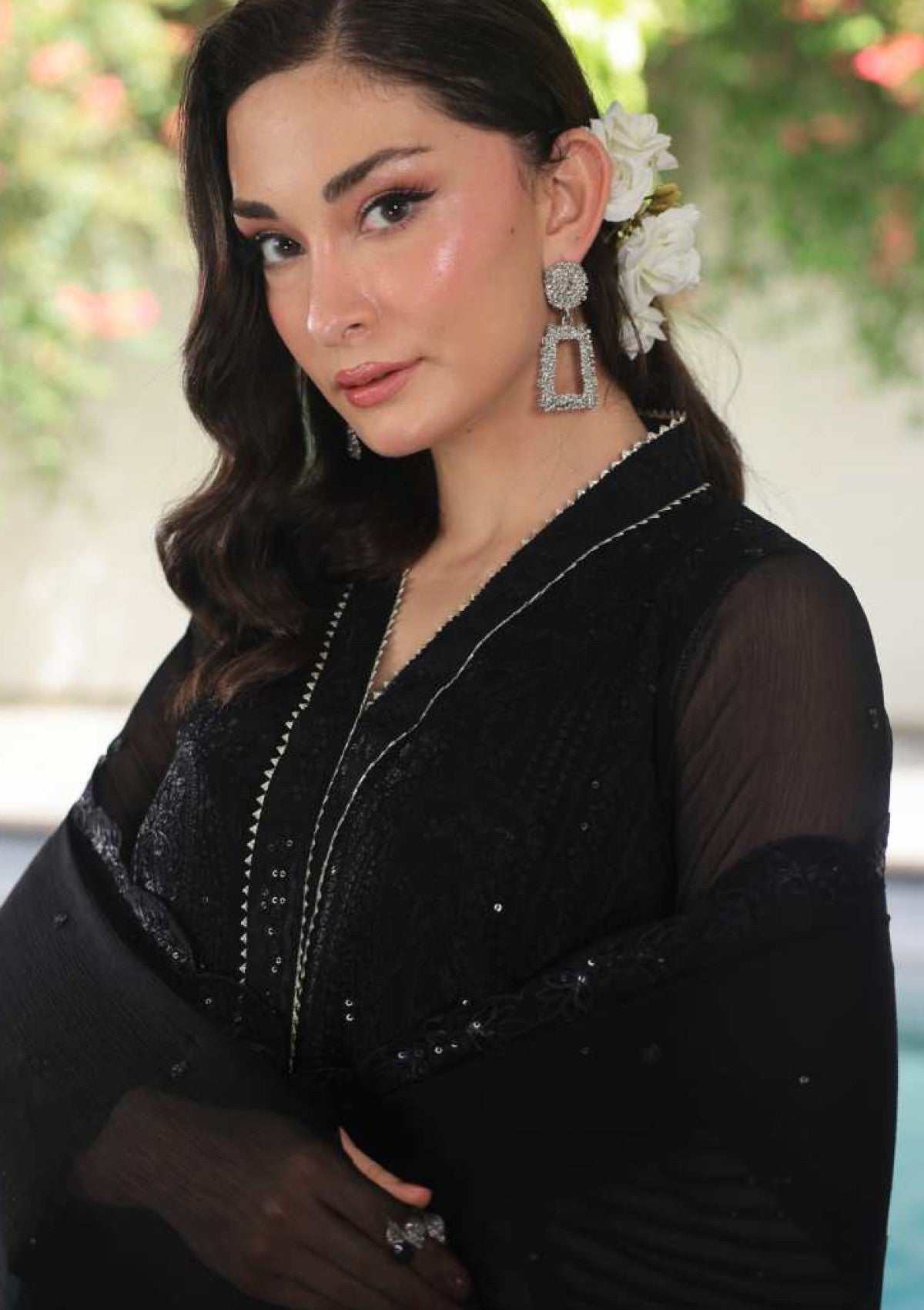 A black chiffon ensemble with detailed embroidery and organza borders, styled with a plain raw silk trouser.