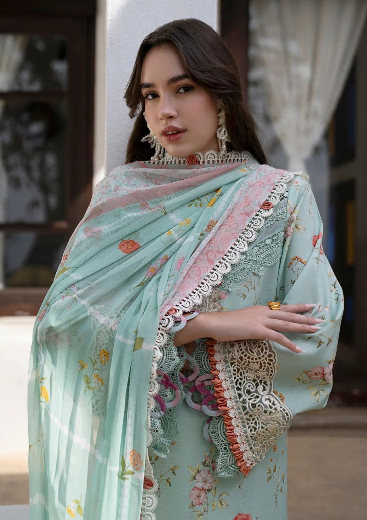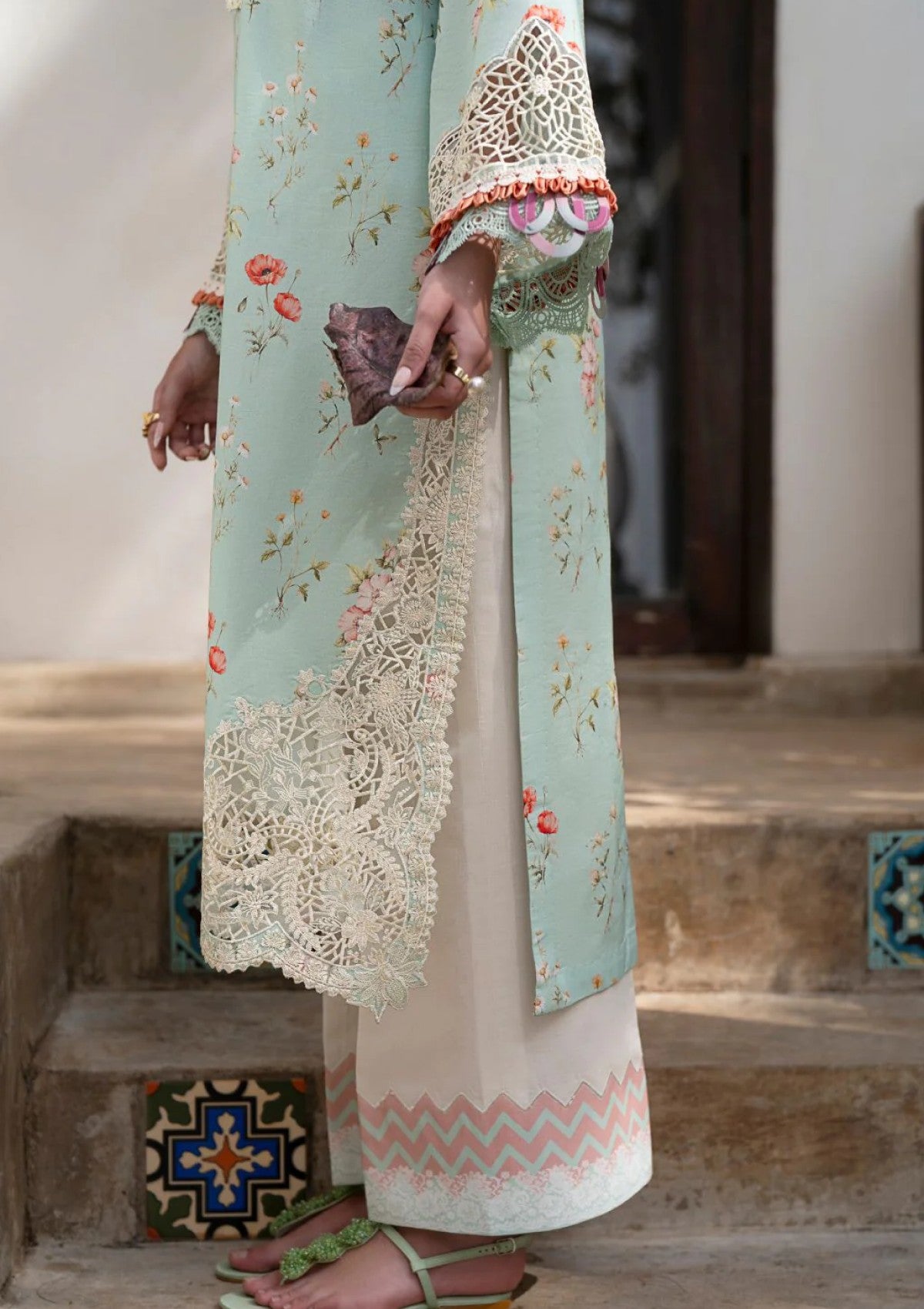 Summer style craving solved – it's Aqua! 🌊 Dive into summer freshness with this delightful ensemble. An aqua mint colored printed base, blooming with a delicate floral composition, sets the tone for breezy elegance. The embroidered cutwork composed daman border adds a touch of exquisite detail, mirrored in the embroidered cutwork style sleeves. Notice the pretty neckline embroidered patti – a subtle yet impactful detail. Paired with dyed trousers featuring printed border finishings and a light-as-air chiffon printed dupatta, Aqua is the epitome of effortless summer chic, designed to keep you feeling cool and stylish all day long.