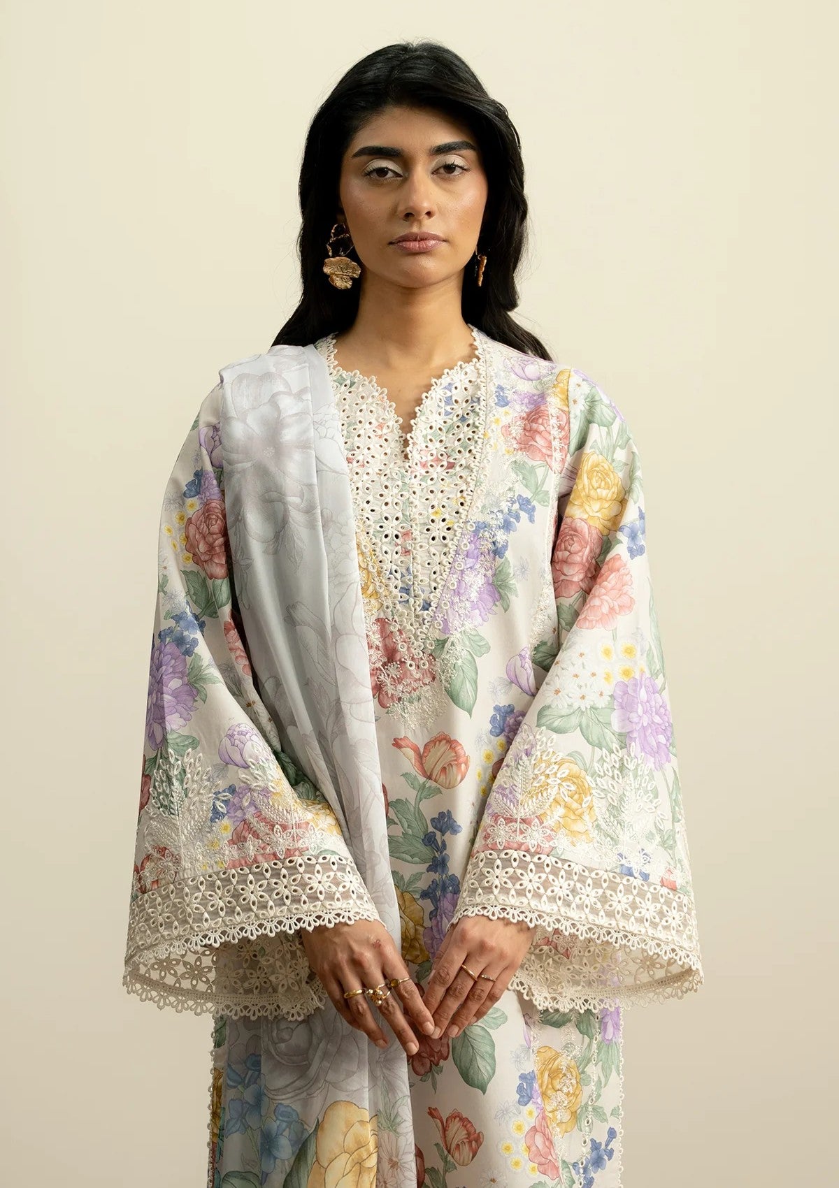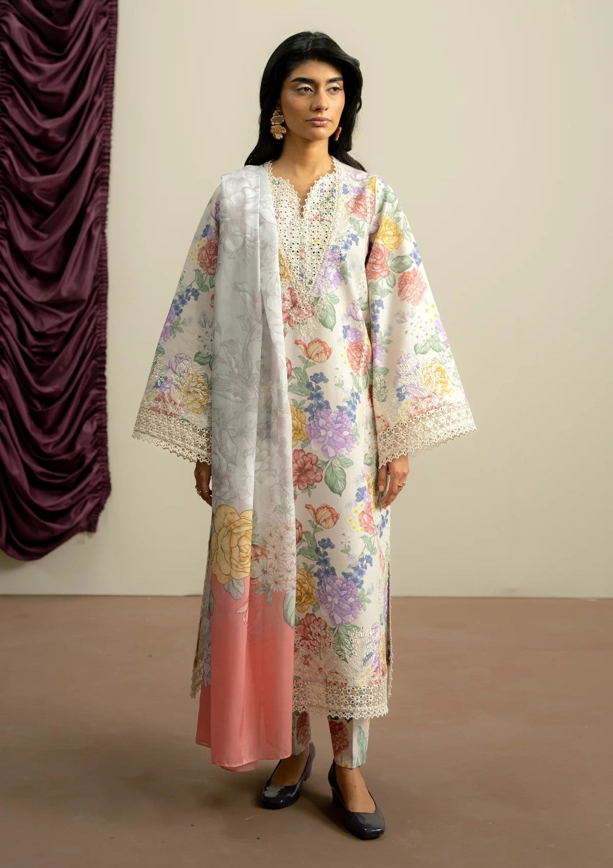 Soft floral prints and a breezy dupatta create a summer look that feels fresh, elegant and effortlessly chic.