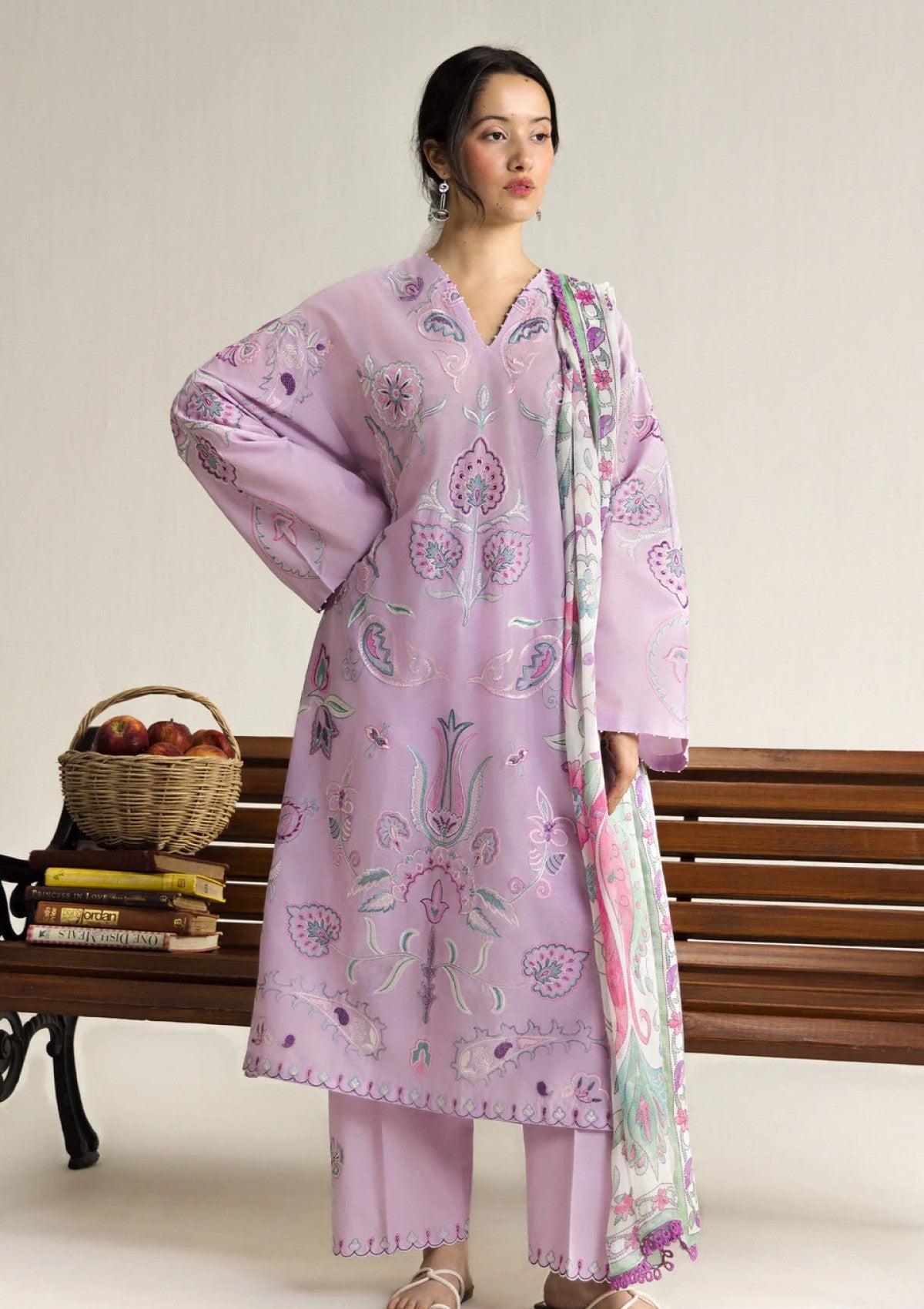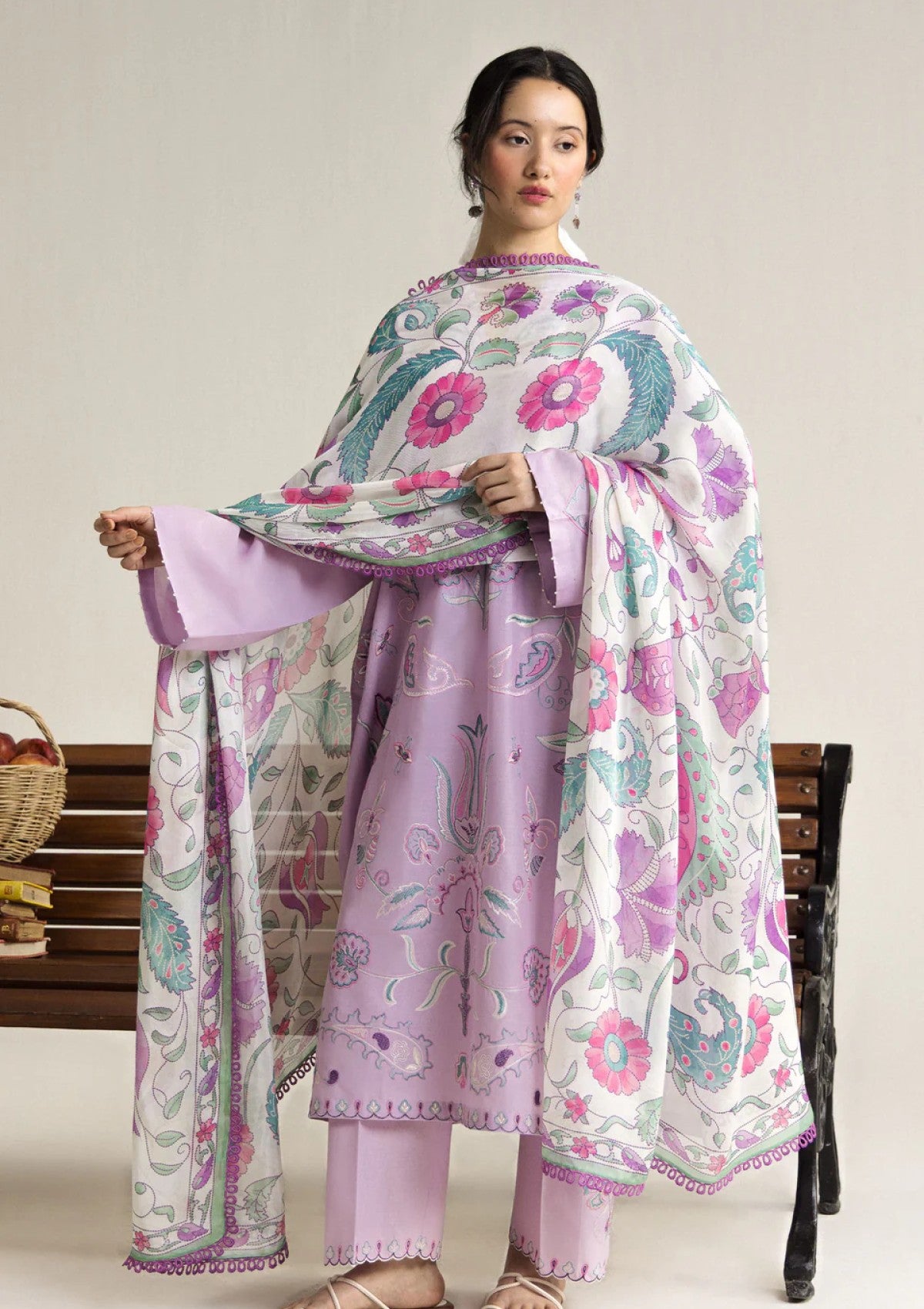 A vibrant, festive composition where traditional ornamentation takes center stage. The richly detailed embroidery, anchored by an ornate neckline and symmetrical paisley-floral motifs, creates a sense of grandeur and celebration. This intricacy is carried through to the dupatta, where bold, full-coverage patterns enhance the visual richness. The overall look is opulent yet controlled, designed to make a statement while retaining elegance.