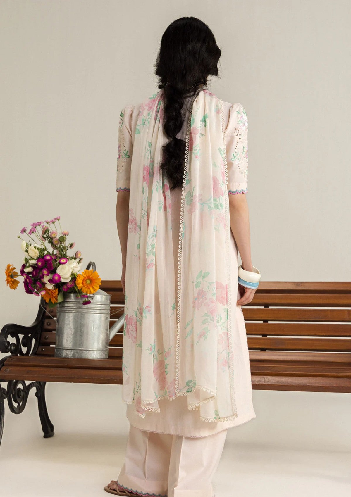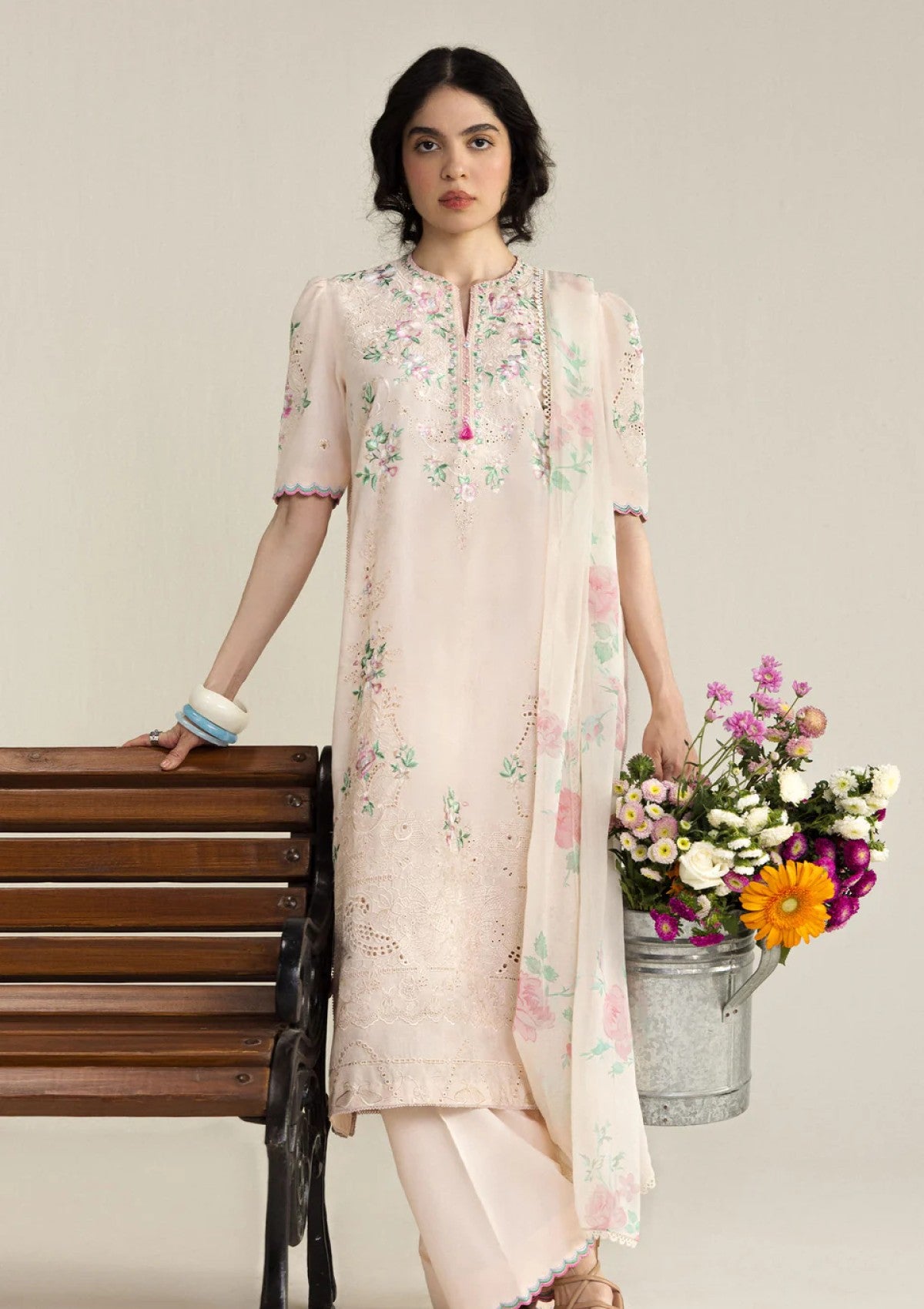 A romantic reinterpretation in softer tones, where the same structured embroidery is warmed by a baby pink base. The design retains its ornate detailing but feels more delicate and feminine. The dupatta enhances this softness with dense floral arrangements, creating a cohesive look that is gentle, graceful, and timeless.