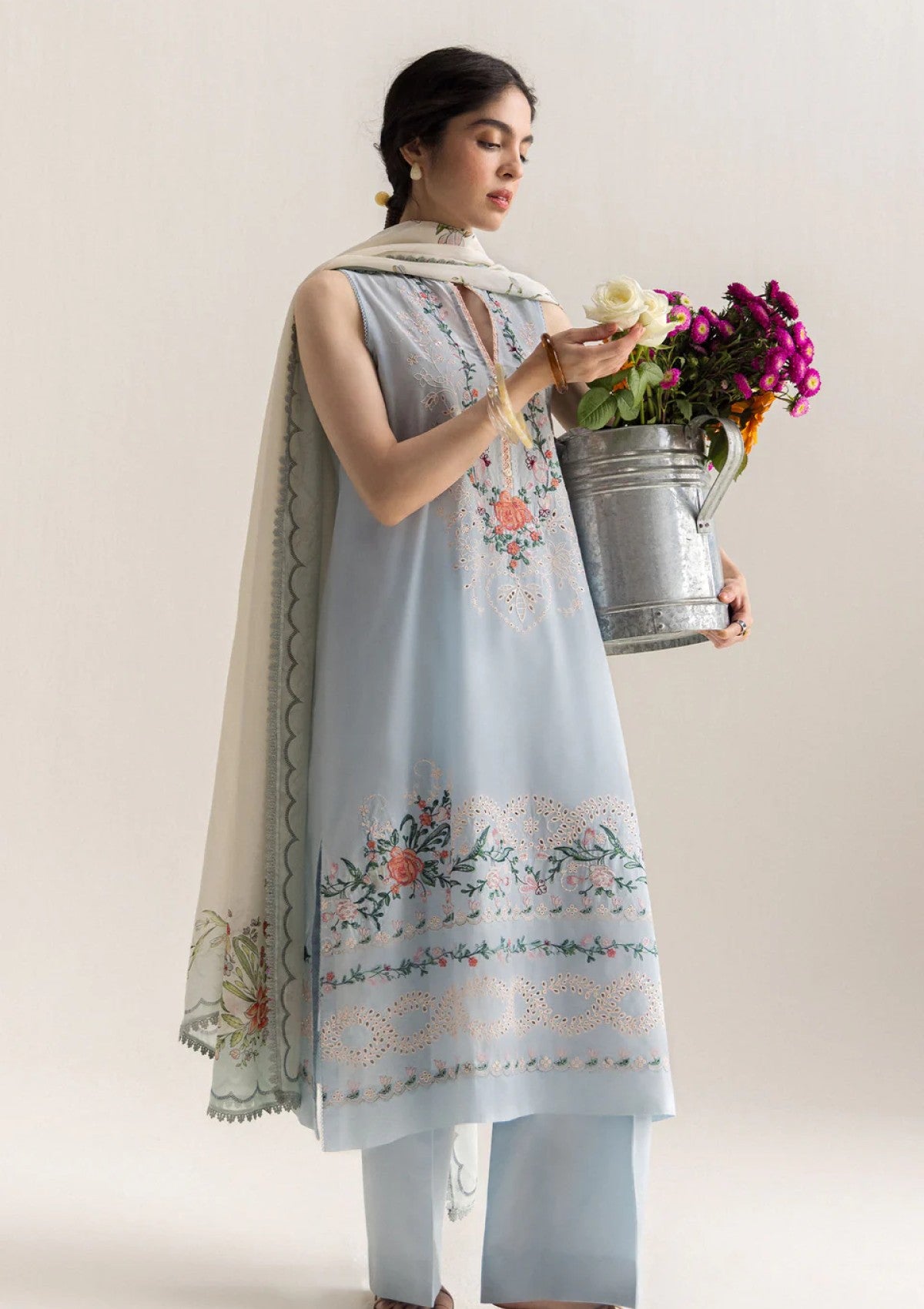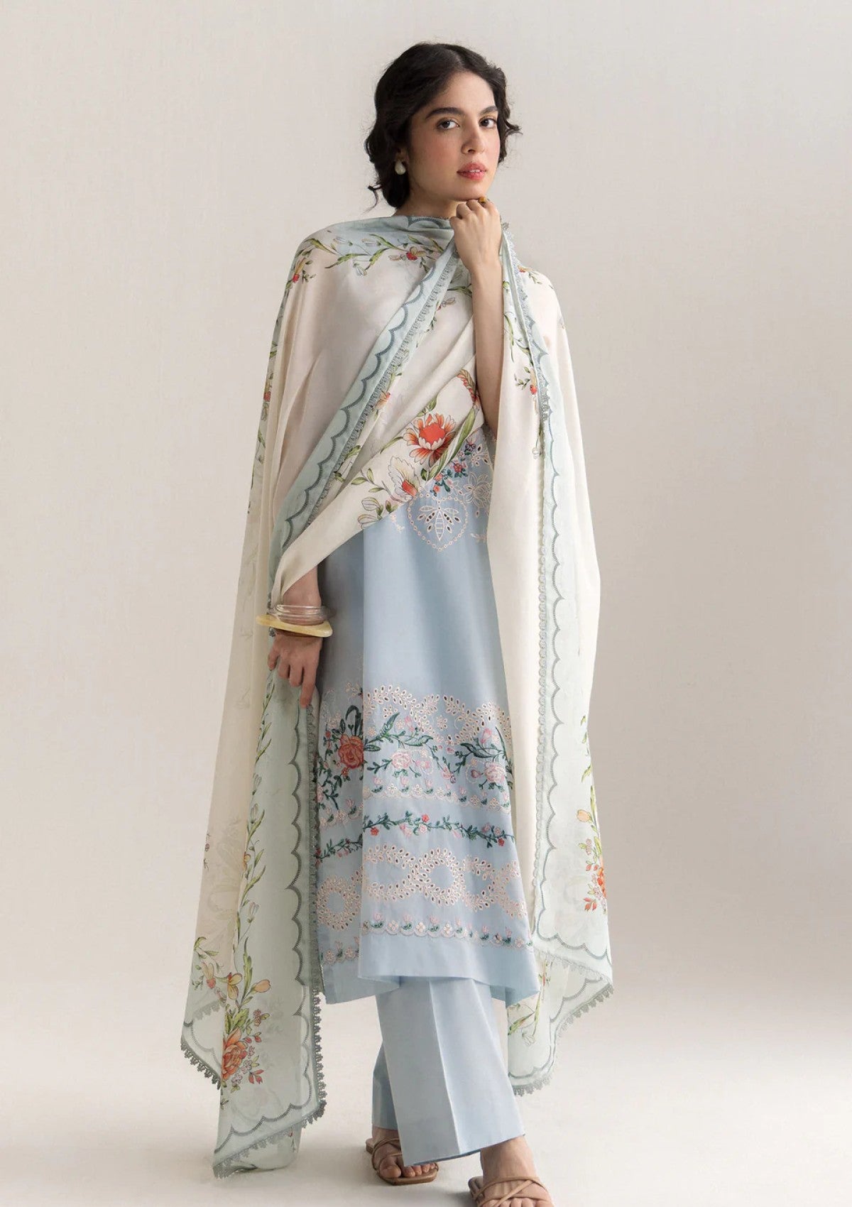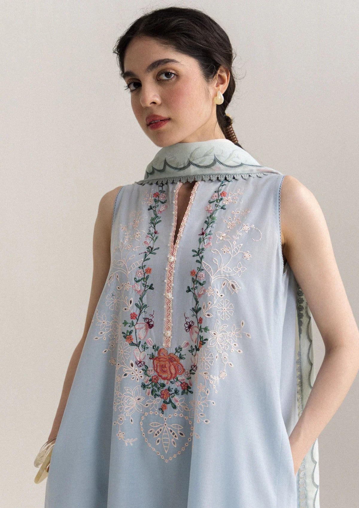 A cooler, more refined counterpart, where icy tones and crisp embroidery create a clean, almost weightless aesthetic. The detailing feels precise and delicate, enhancing the freshness of the base. The dupatta follows suit with minimal, airy florals, resulting in a look that is understated, polished, and quietly striking.