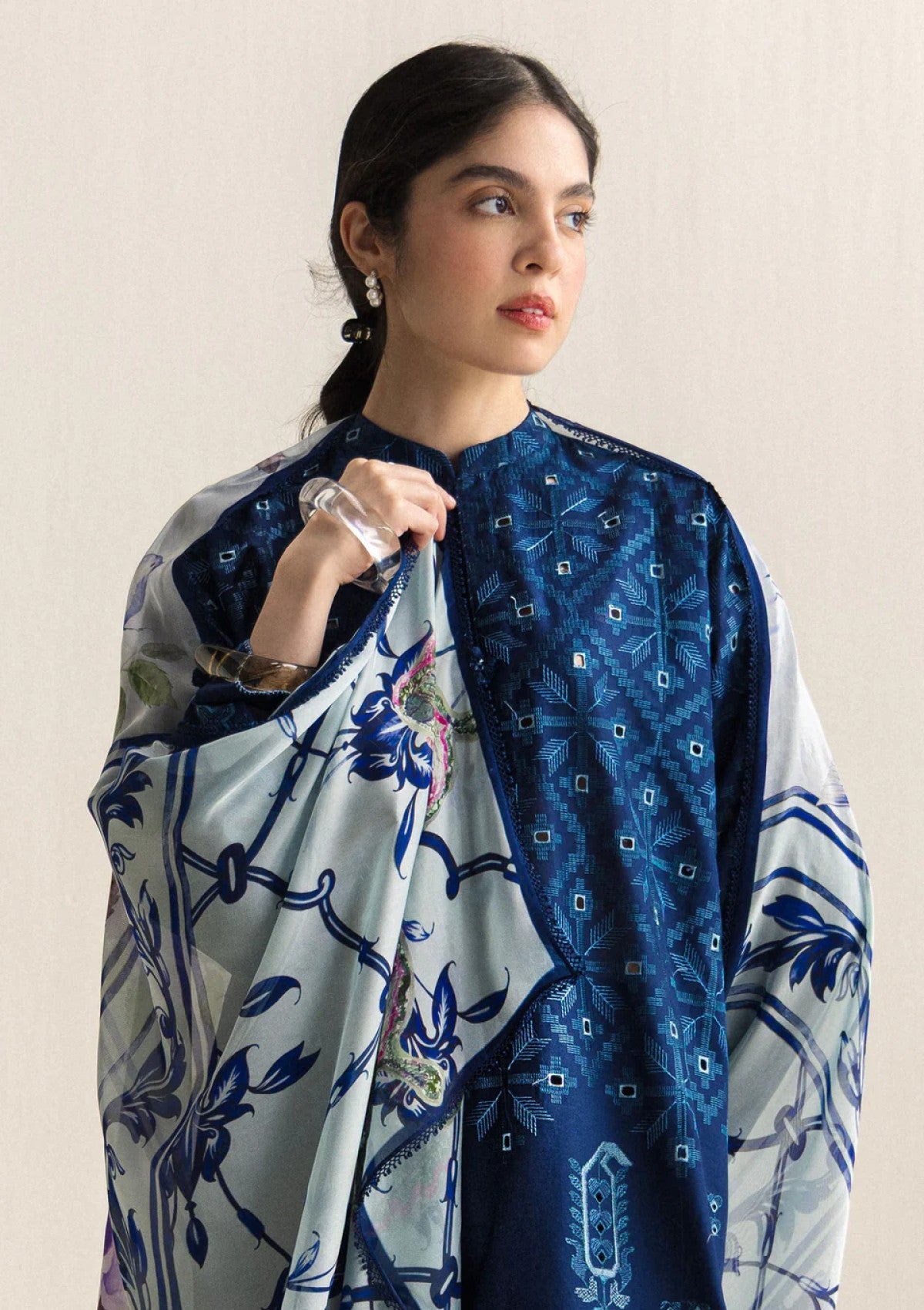 A dramatic, deep-toned composition where geometric embroidery is layered with stylized florals, creating a rich and textured surface. The structured motifs lend a contemporary edge, while the dupatta introduces a more whimsical narrative through butterflies and blooming roses. The contrast adds dimension, making the look both bold and expressive.