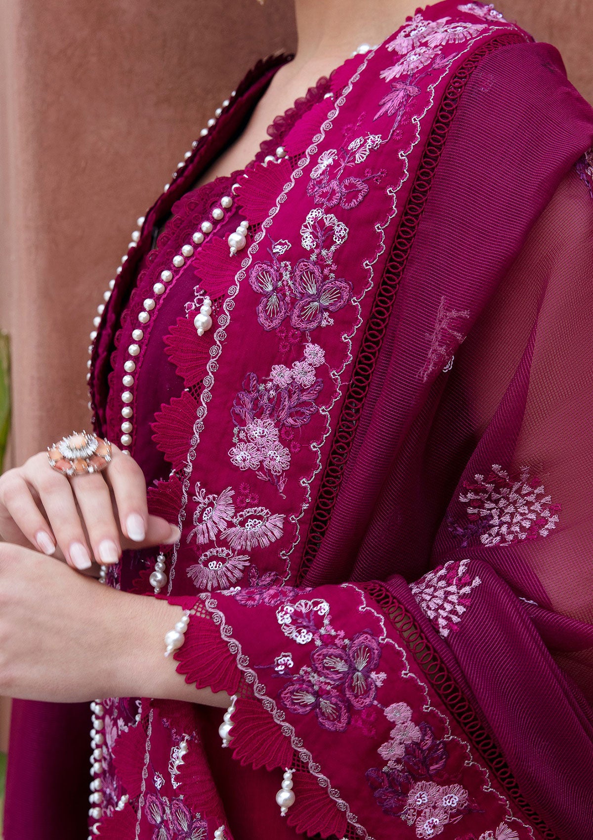 Applique and color blocking technique on a canvas of Deep Plum Lawn. Embroidered with finest resham and tatami tankas comes together as a striking master piece.