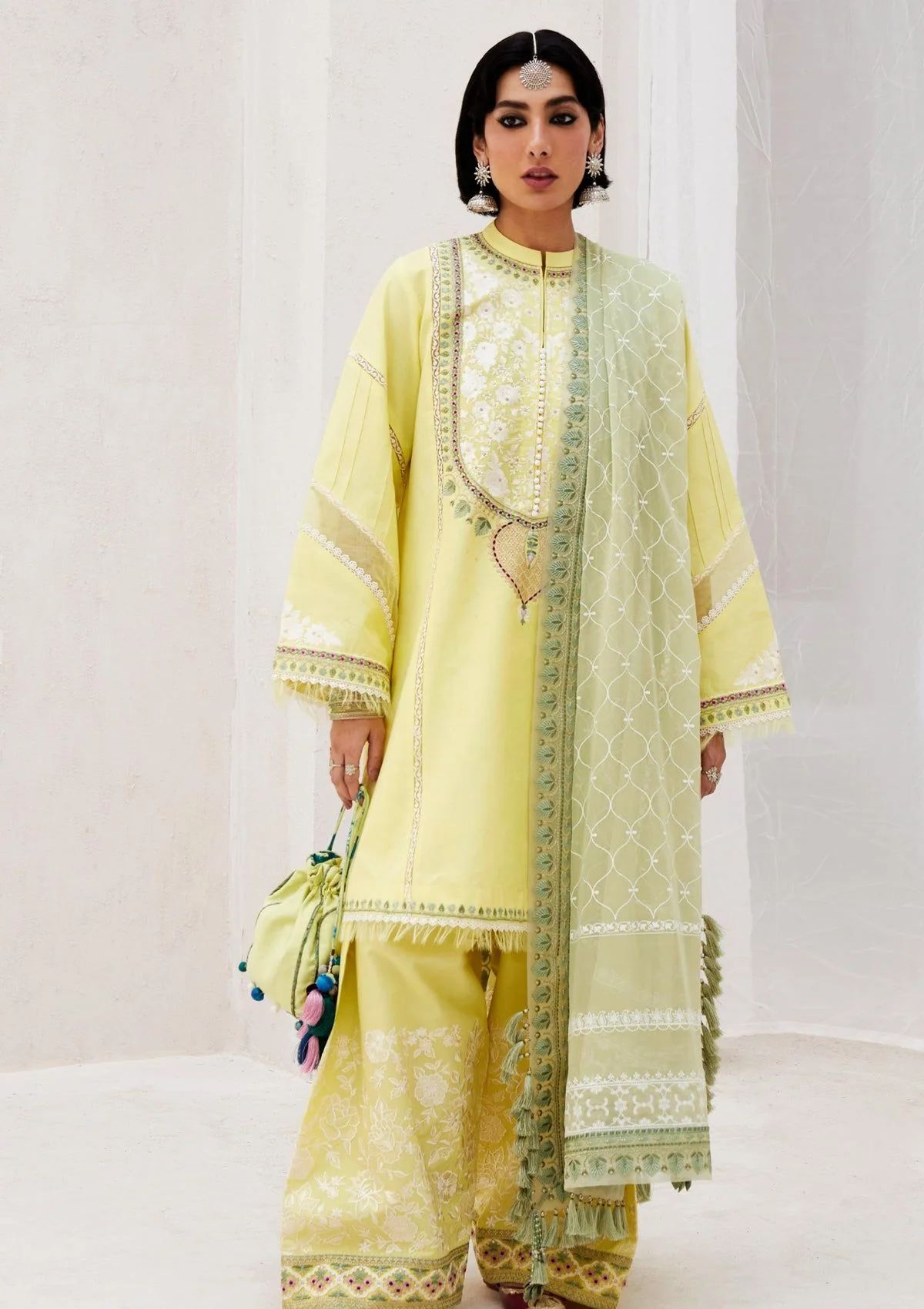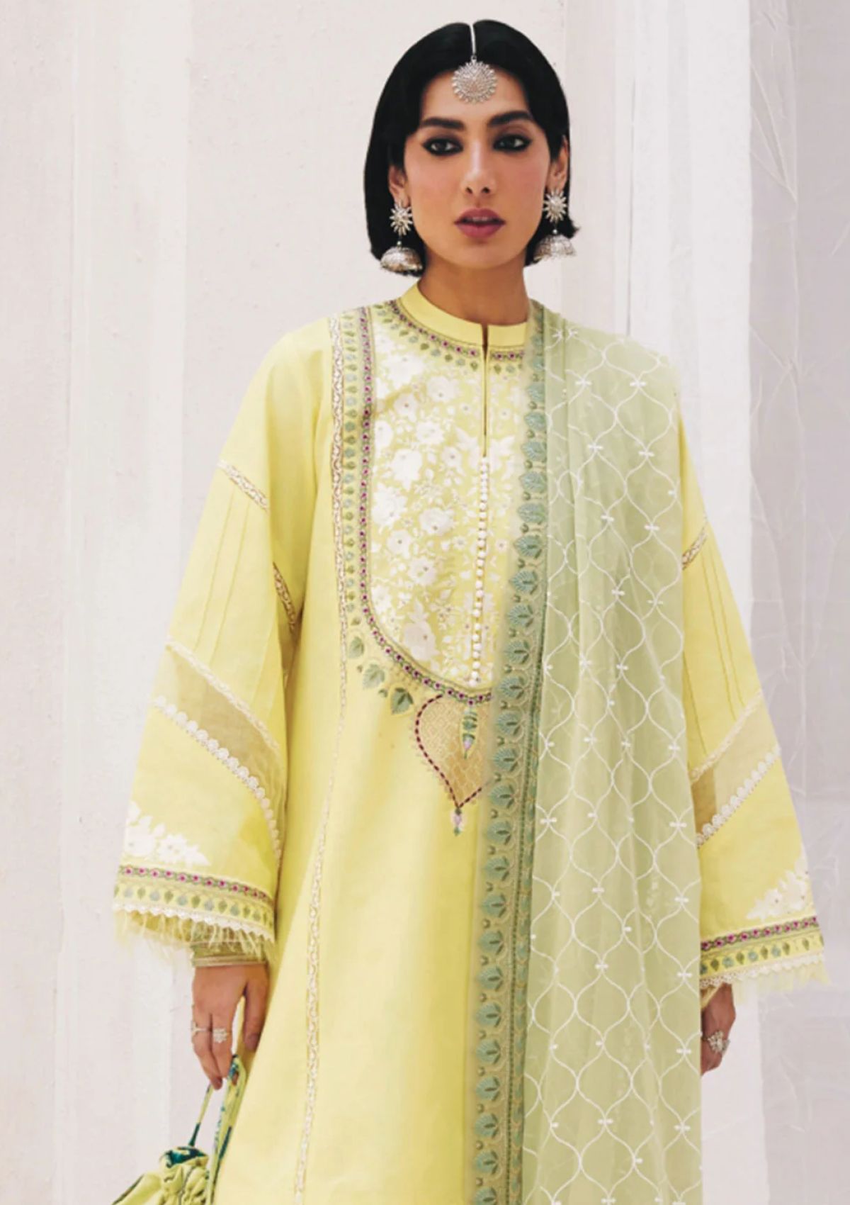 The Dilara kurta brings beautiful pastels to life with embroidery on a jacquard surface and a silk dupatta in paste print and embroidery on the borders.