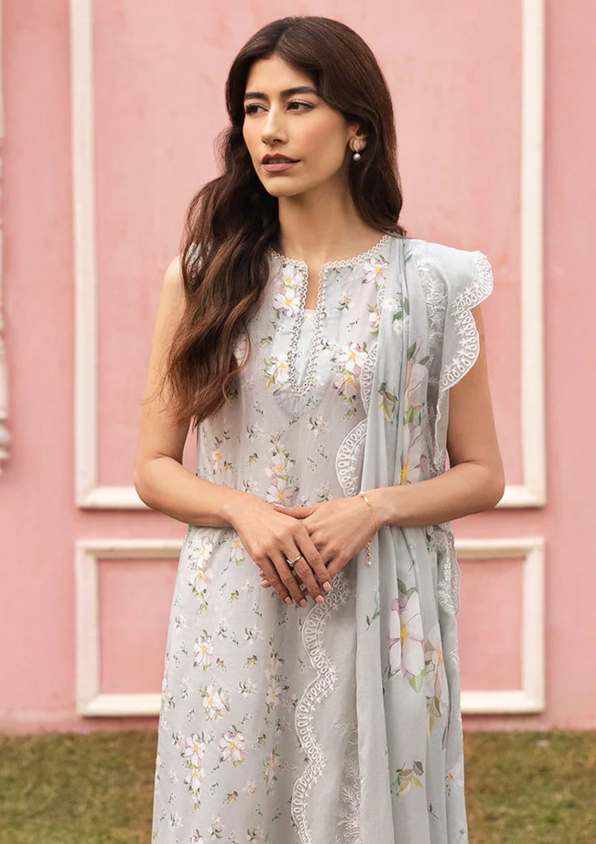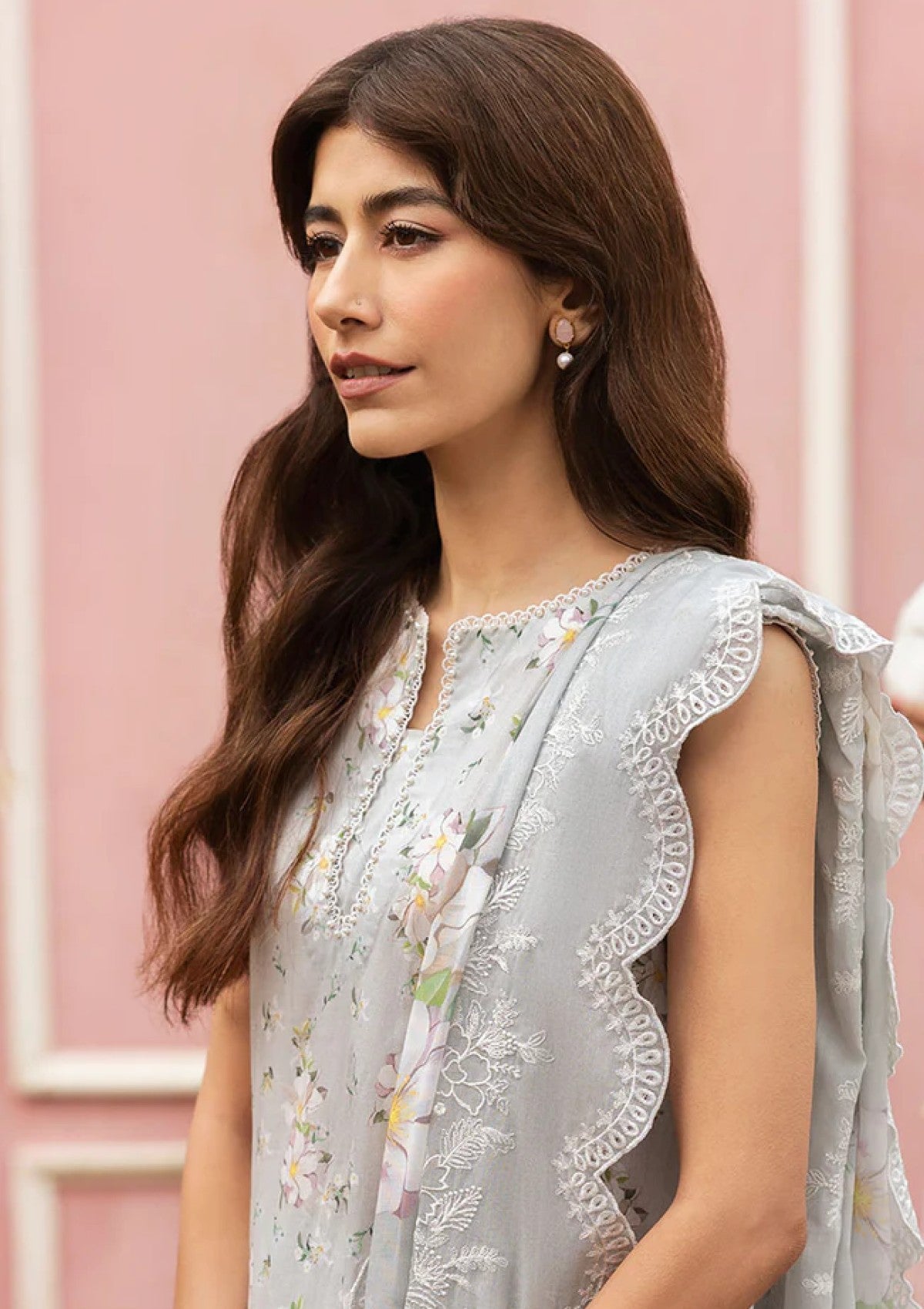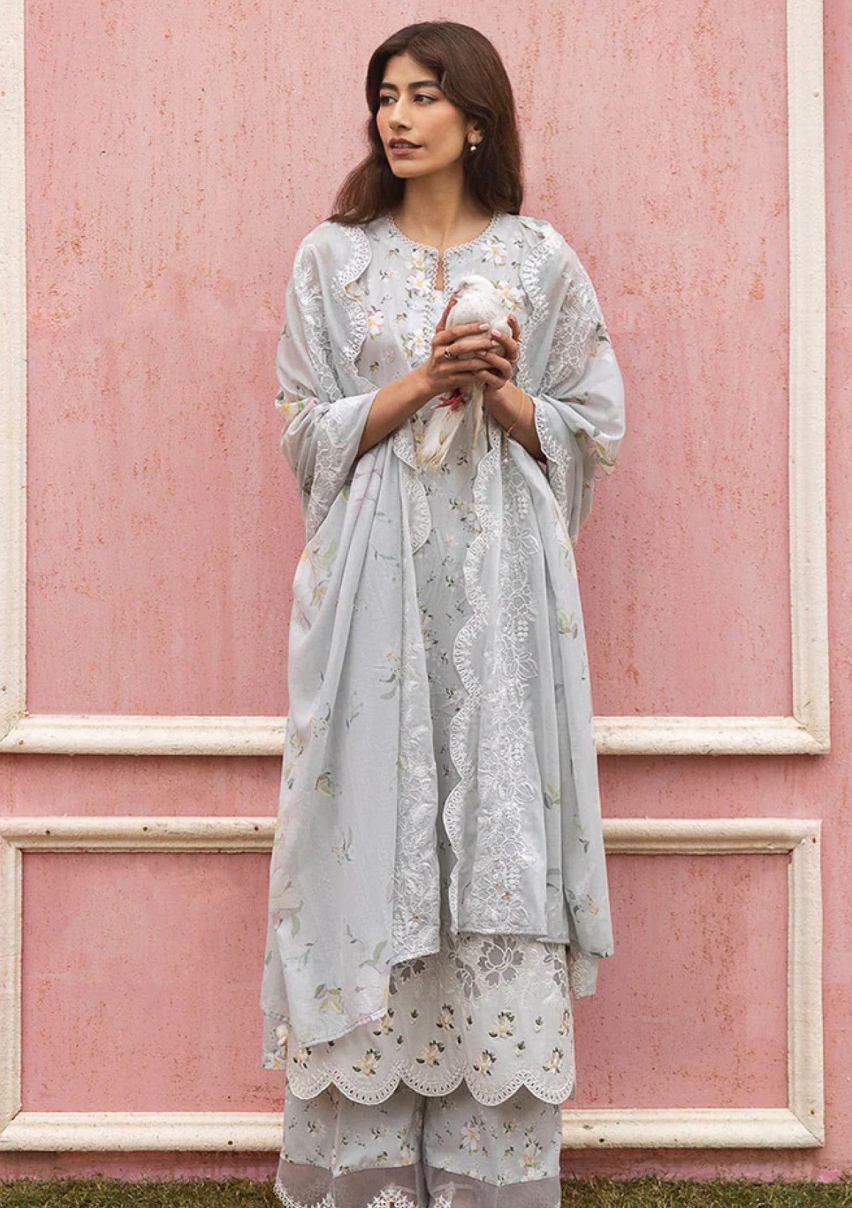 Introducing the GRAY FROST-3PC Printed Lawn Suit. Made from high-quality lawn fabric, this suit features a beautifully printed shirt with a 40" embroidered applique border for the hem. The cambric printed trouser is accented with a 60" embroidered patti, and the lawn dupatta is both printed and embroidered, adding a touch of elegance to this ensemble.