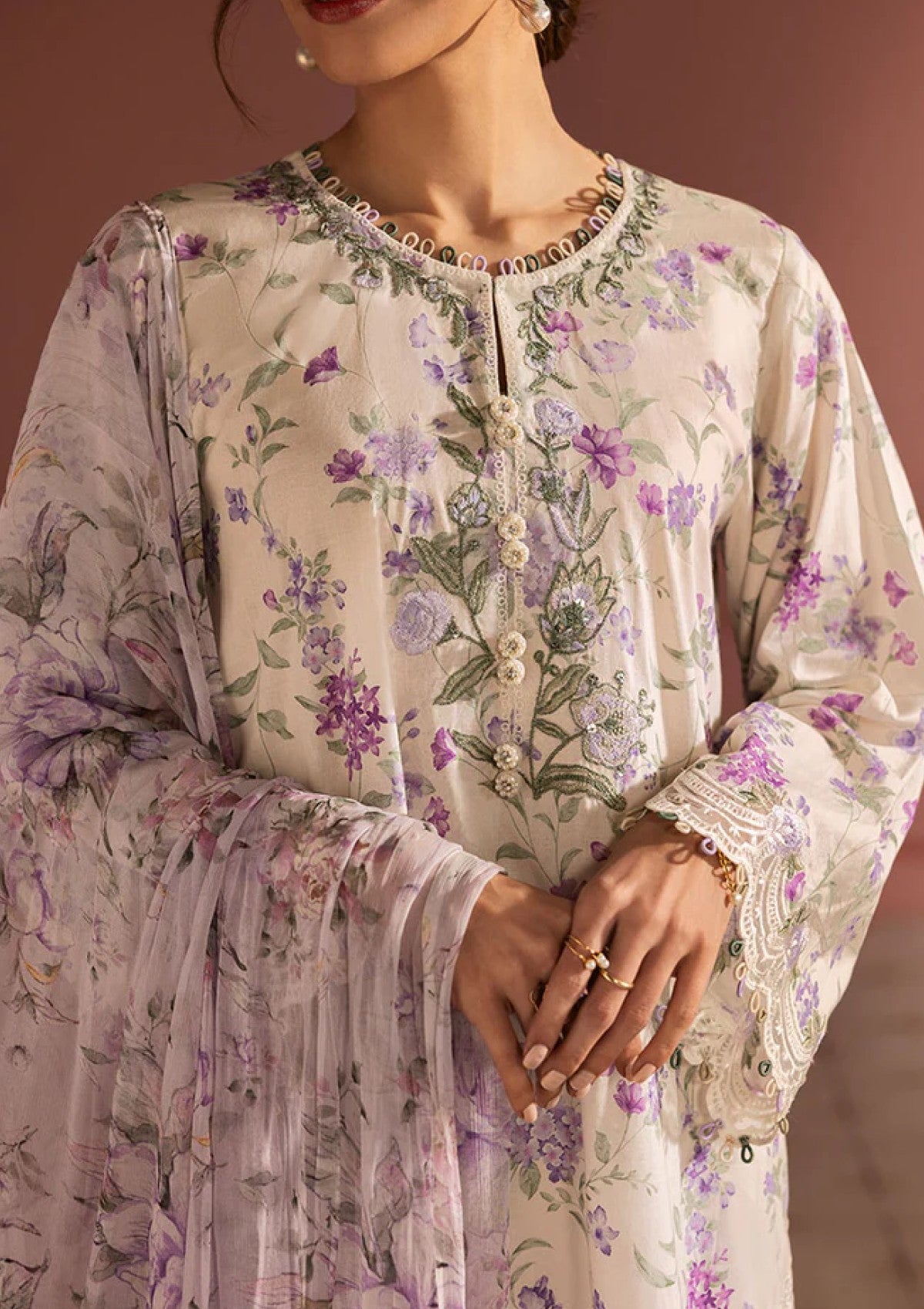 This LILAC BLOOM 3PC PRINTED LAWN SUIT features a lawn printed shirt with an embroidered neckline, complemented by 60" embroidered patti for sleeves and hem. The cambric printed trouser and chiffon printed dupatta add a touch of elegance and comfort to this outfit. Perfect for any occasion, this suit offers a stylish and sophisticated look.