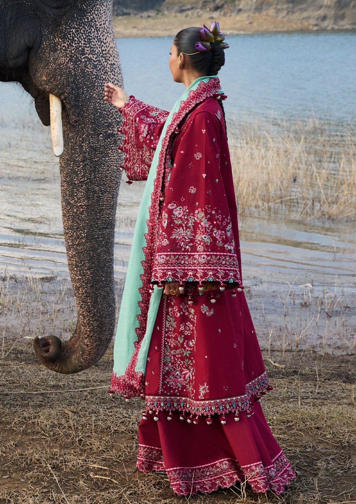 A maroon ensemble presents a picturesque vision of richness and sophistication, enhanced by meticulously executed embroidery on lawn fabric. Alluring floral embroidery in summery hues lends an ethereal quality. A mint green cotton net dupatta, featuring a maroon embroidered organza border, complements the outfit. This modern and dazzling silhouette is completed by coordinating maroon trousers..