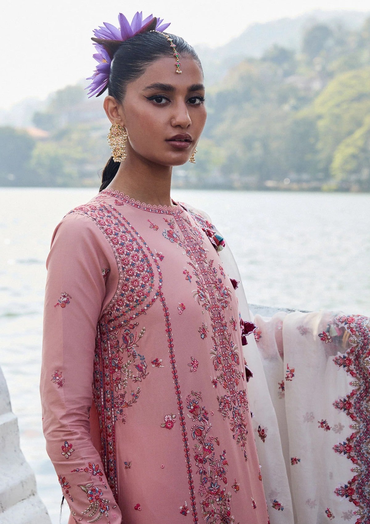 A rose pink ensemble presents a picturesque vision of modern elegance, enhanced by meticulously executed embroidery on lawn fabric. Alluring floral embroidery, featuring border detailing in summery hues, lends an ethereal quality. An ivory organza dupatta, adorned with intricate embroidery and a complementary border, completes the ensemble. This modern and dazzling silhouette is finished with coordinating rose pink embroidered trousers.