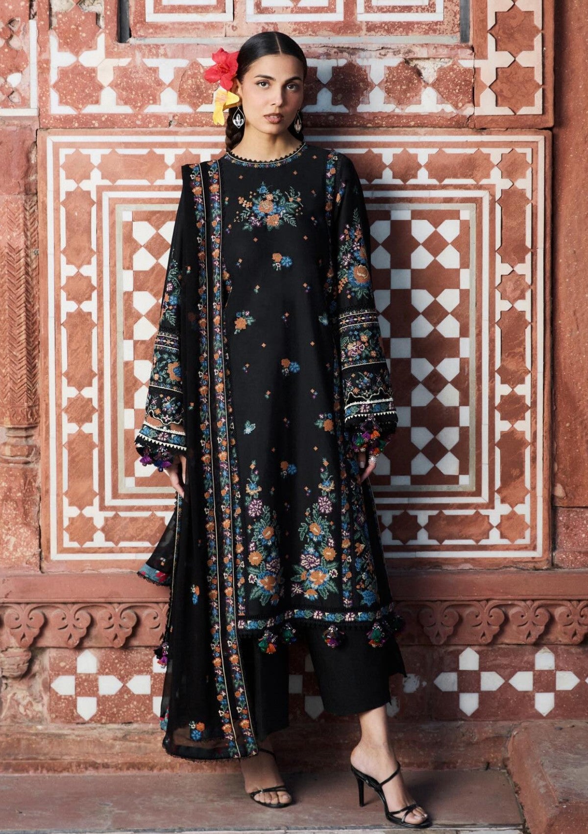A striking jet black ensemble, a true statement piece for the festive season. Designed in a graceful A-line silhouette, it features vibrant cross-stitch embroidery arranged with artistic precision, adding depth and character to the look. Paired with a black chiffon dupatta adorned with delicate embroidery, this outfit exudes timeless elegance and refined allure.