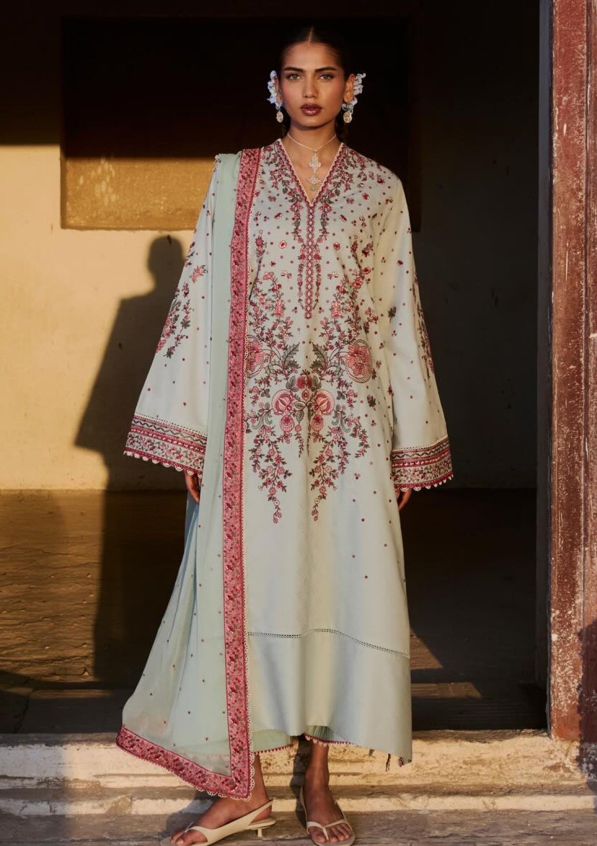 A serene aqua dobby ensemble, perfect for the festive season, exuding a soft and soothing charm. It features delicate all-over embroidered spray detailing that flows gracefully from top to bottom, and is paired with a chiffon dupatta accented with a stylish color-block border for a modern touch.