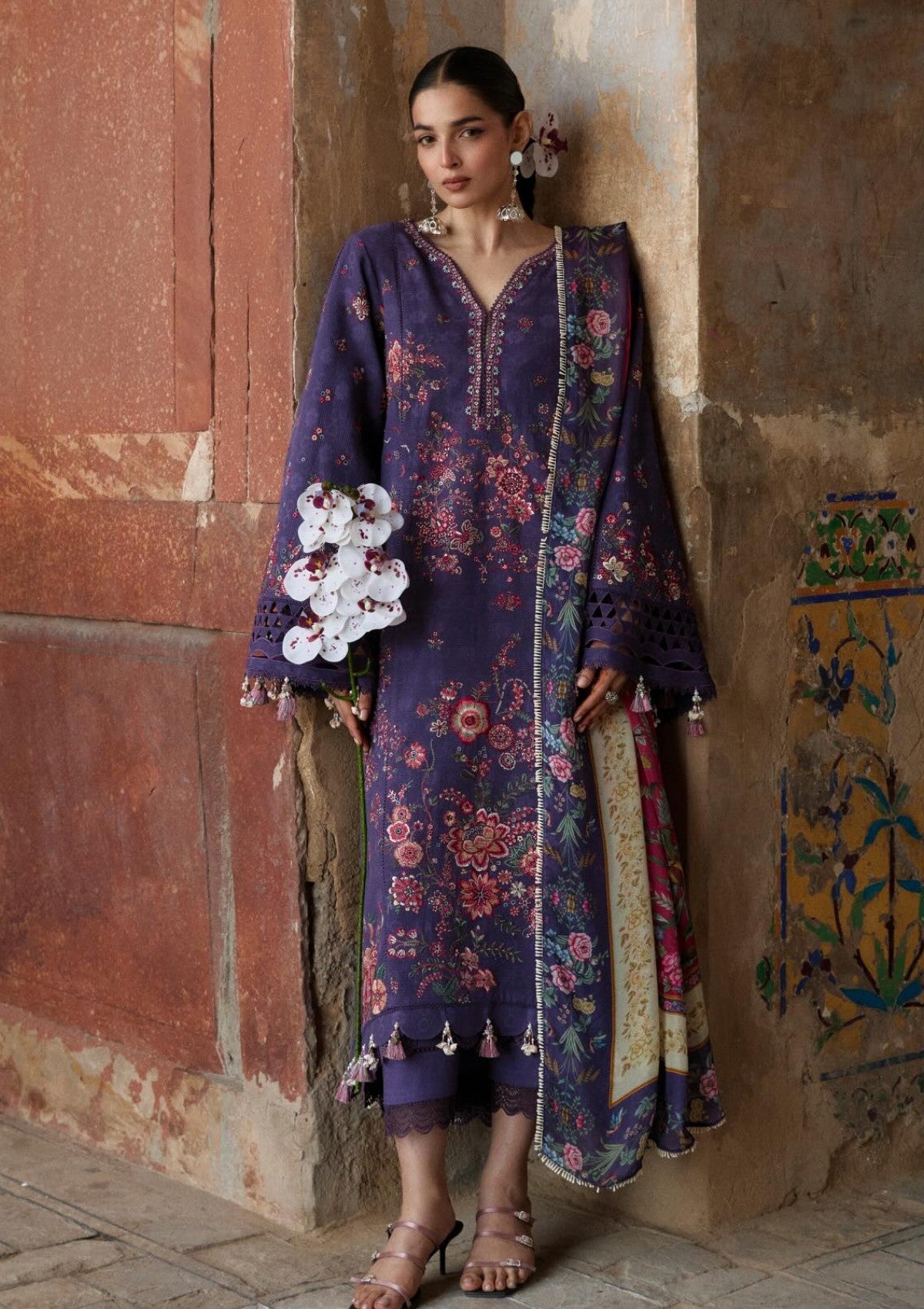 A rich dark purple jacquard ensemble designed for the summer festive season, featuring a striking asymmetric composition accented with lively hues of red and pink. Paired with a beautifully printed silk dupatta, this look exudes modern elegance with a vibrant twist.