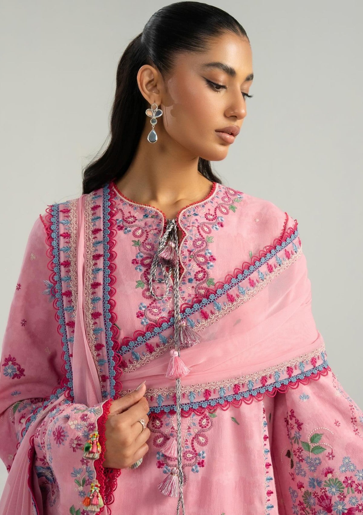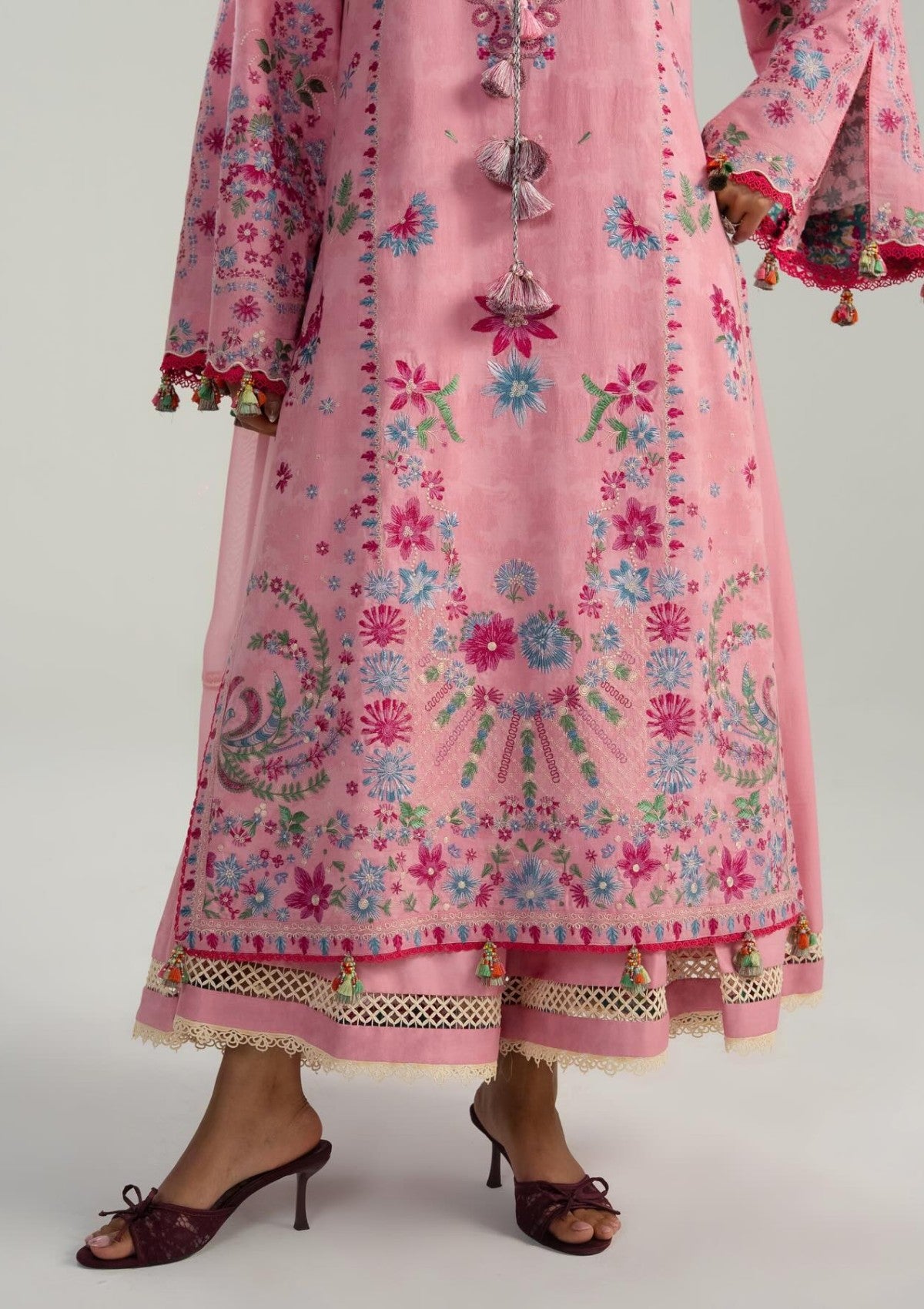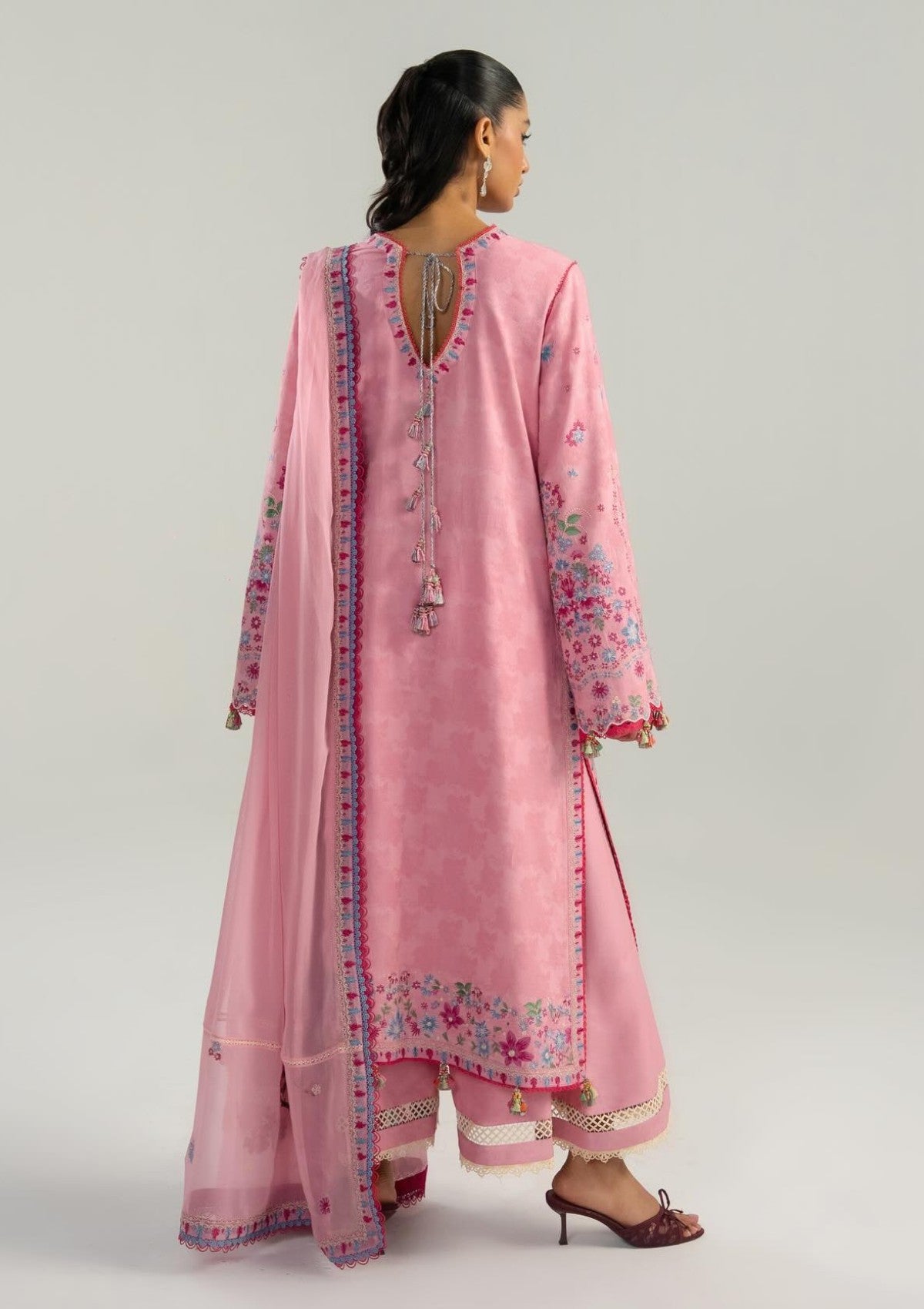 A delicately soothing pink ensemble, designed to brighten the festive season with effortless elegance. The piece features a harmonious blend of pink and blue hues arranged in a refined mirror-style embroidery, adding subtle depth and charm. Crafted on rich jacquard fabric, it beautifully enhances the overall design aesthetic. Paired with a matching pink chiffon dupatta, this ensemble offers a graceful and polished finish.