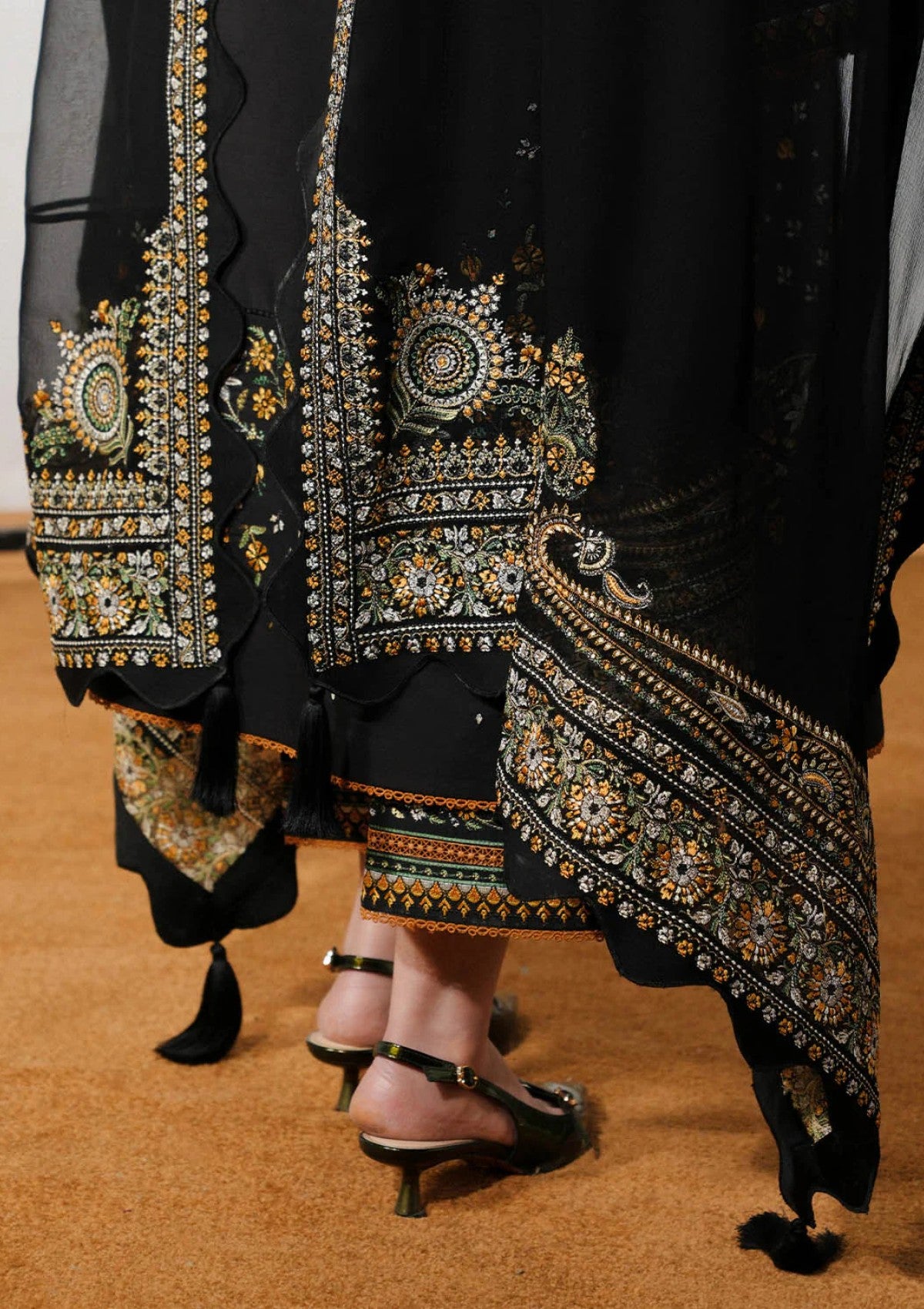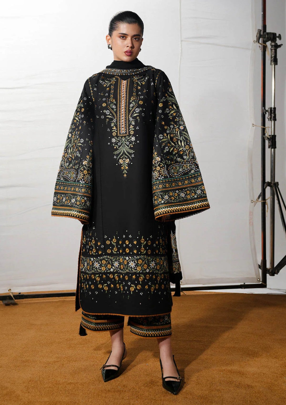 A striking black long shirt, richly adorned with multicolour traditional embroidery and delicate tilla work, exudes timeless sophistication. The matching bell sleeves, detailed with the same intricate embroidery and tilla, add a graceful, flowing dimension. Paired with black dyed culottes featuring embroidered borders, the ensemble is completed with a multicolour, tilla-embroidered chiffon dupatta, bringing movement, texture, and a refined classical charm to the overall look.