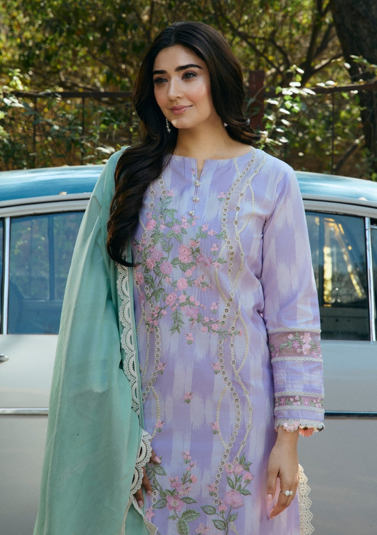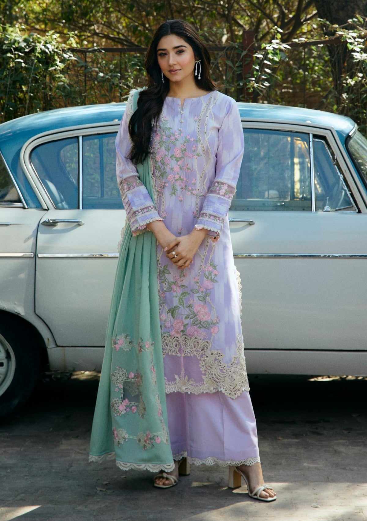 Bringing a fresh breeze of elegance, MAHRANG is a 3-piece unstitched silhouette in lilac and mint green hues. The shirt is adorned with intricate cream crochet effect embroidery along with vintage floral accents in shades of green and pink, with dainty floral borders on sleeves .It is complemented with solid trousers and an accent mint dupatta on pure Swiss voile fabric featuring bold embroidered pallus, making this outfit perfect for your summer day out.