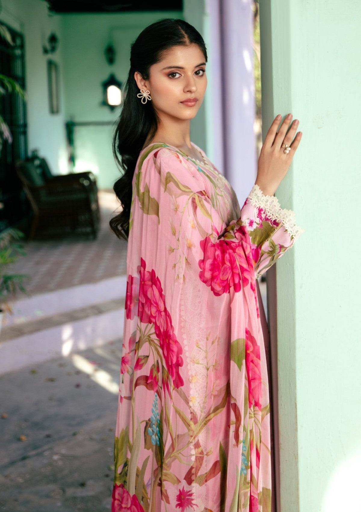 A soft pink digital-printed 3-piece unstitched lawn number embedded with delicate cutwork embroidered borders on organza for the neckline, side seam, and hem in cream hue over the shirt. Paired with a cambric dyed trouser and a multi-hued digital-printed chiffon dupatta, this outfit is the perfect amalgam of tradition and contemporary flair.
