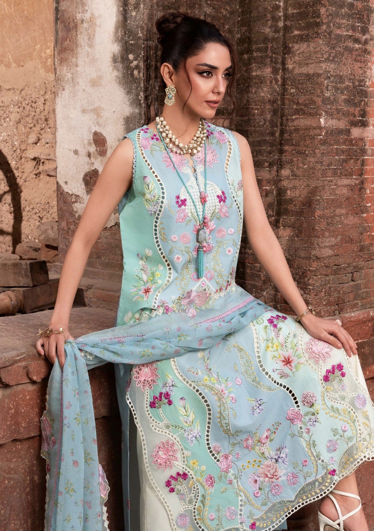 This ensemble is more than fabric and thread — it is the outcome of relentless dedication. From the first sketch to the final stitch, every stage of designing, sampling, and production carries our extraordinary effort and uncompromising attention to detail — serene, refined, and endlessly graceful. This printed canvas is artfully panelled in three harmonious tones: two shades of tranquil blues paired with a cool jade green. Delicate floral embroideries bloom across the fabric in shades of pink, sage, and wine, each petal and leaf intricately detailed to capture nature’s quiet poetry — like a spring morning suspended in a dream. Styled with ivory trousers, accented by ethereal organza cutwork that moves with effortless fluidity, the look feels both timeless and light. The chiffon dupatta, enriched in a warm blush hue, is a vision of fine craftsmanship — adorned with dainty rose prints and framed with embroidered rose clusters along all four sides.