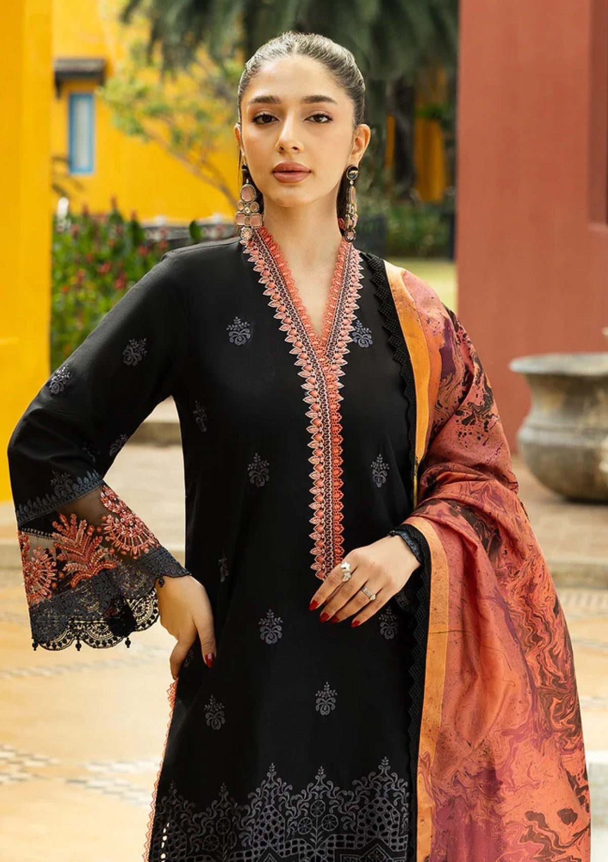 This midnight black shirt, exquisitely embellished with charcoal chikankari embroidery in contrasting rust and peach hues. The intricate detailing highlights the traditional craftsmanship, creating a visually captivating design. Accompanied by a lavishly marble patterned dupatta in shades of Rust, orange and black. The fusion of classic black with bold, warm tones adds a contemporary twist to this timeless attire.