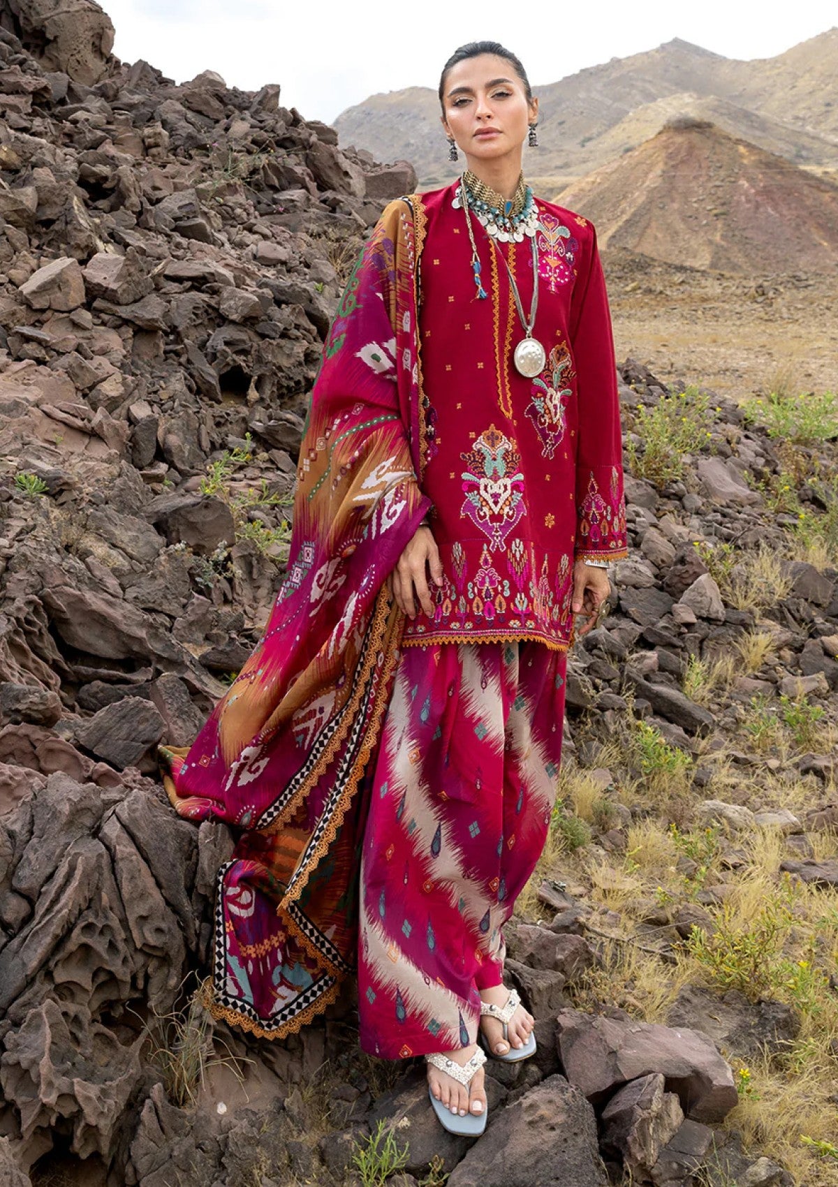 This chikankari ensemble blends heritage with effortless elegance. Rendered in a rich crimson palette, the delicately embroidered shirt is paired with a fluid, patterned shalwar and a statement dupatta that moves beautifully with every step. Intricate detailing and artisanal motifs pay homage to traditional techniques, while the relaxed silhouette keeps it modern and wearable—quietly powerful, rooted in culture, and styled for today.