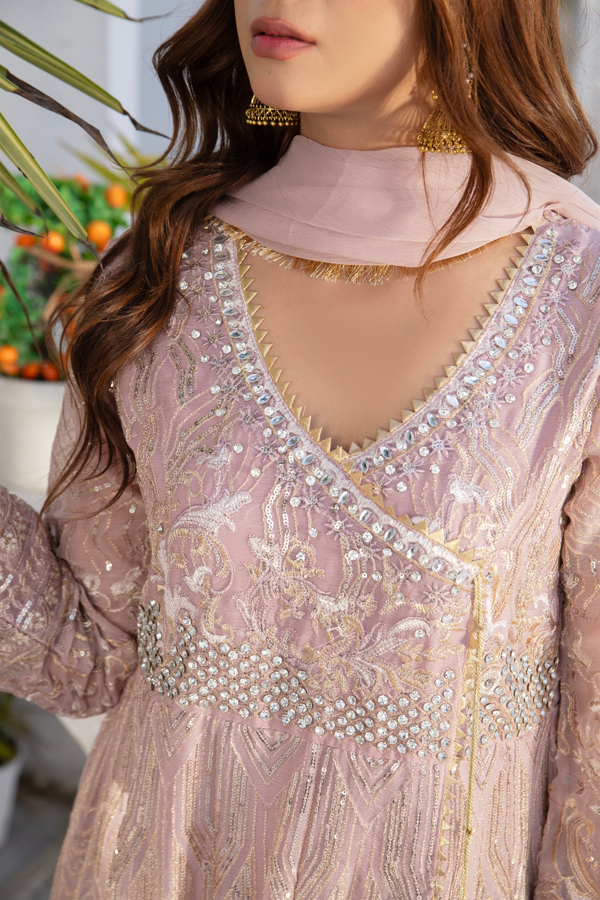 This lovely angrakha style outfit sounds very beautiful and traditional, it is created using handcrafted resham & tilla work and the finest embroidered border on the sleeves and daman. A handmade dori tassel on the front of the shirt adds a unique and charming touch. Intimate events this season call for the pairing of this timeless shirt with a malai crap bottom and chiffon dupatta with kiran lace border. This epitome of real pulchritude would provide you with rich appeal in the event.