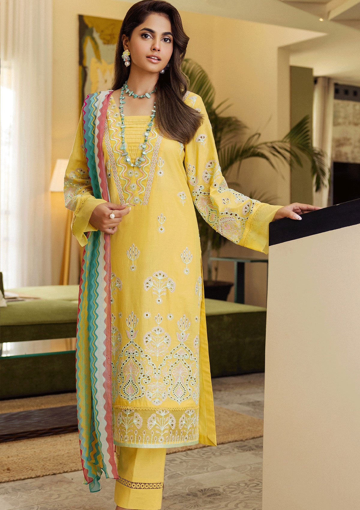 3-Piece | Stitched |Stunning Lemon colour with presence of a garden in its embroidery, paired with a light on hands, colourful printed chiffon dupatta, this piece is perfect for a summery Eid.
