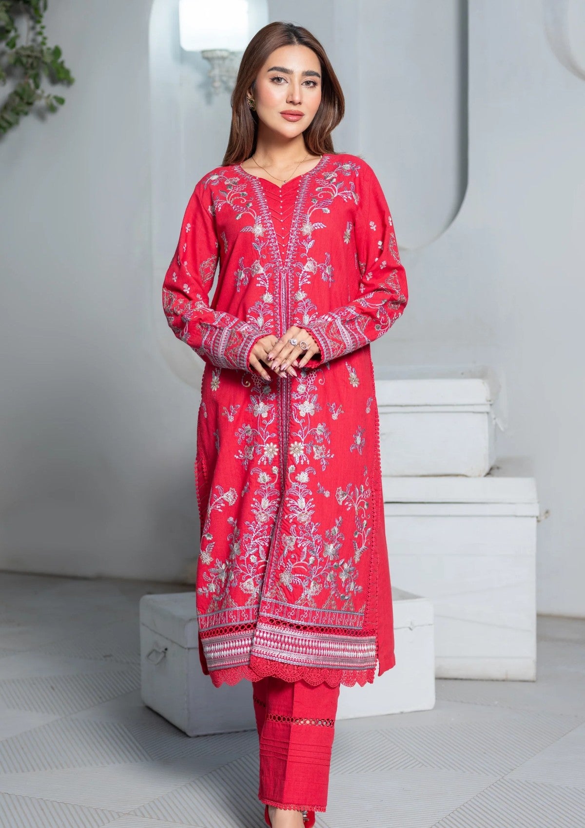 This is a classic Red Khaddar fabric dress that provides a canvas for multicolored embroidery to shine through in the form of delicate artwork. This dress is perfect for special occasions, with its heavily defined thread work.