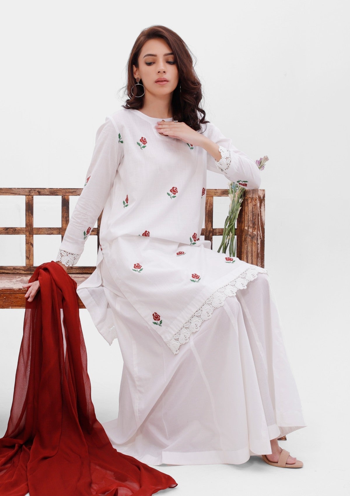 Step into refined elegance with this creamy off-white attire adorned with delicate maroon and green floral hand embroidery on the shirt, accompanied by a maroon chiffon dupatta. A perfect choice for showcasing sophistication and style this mid-summer season.