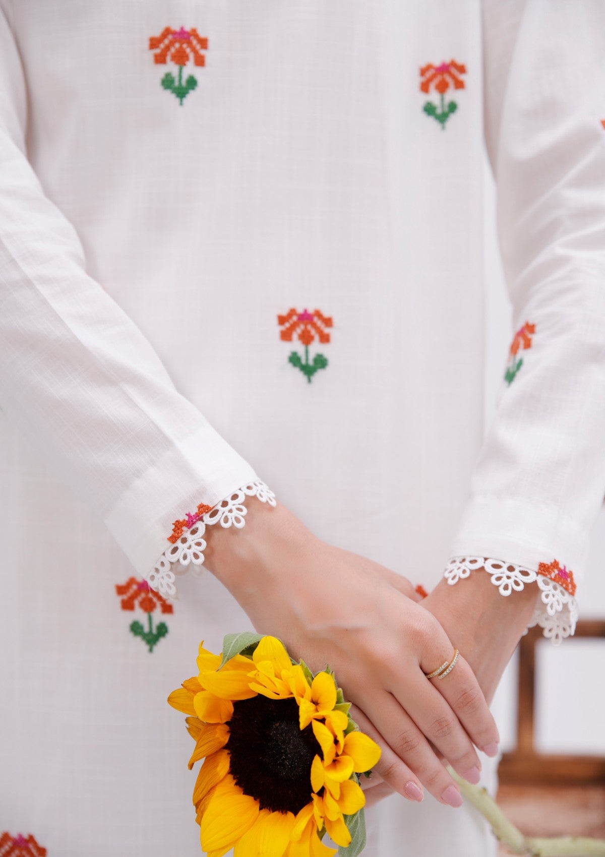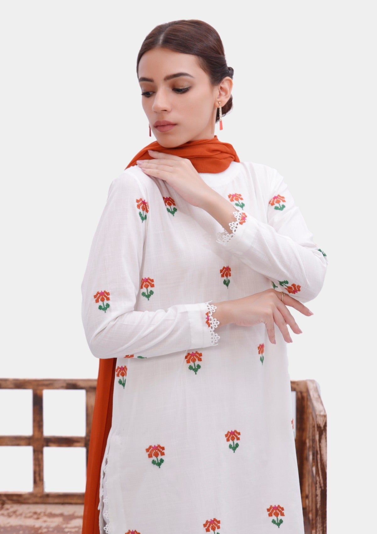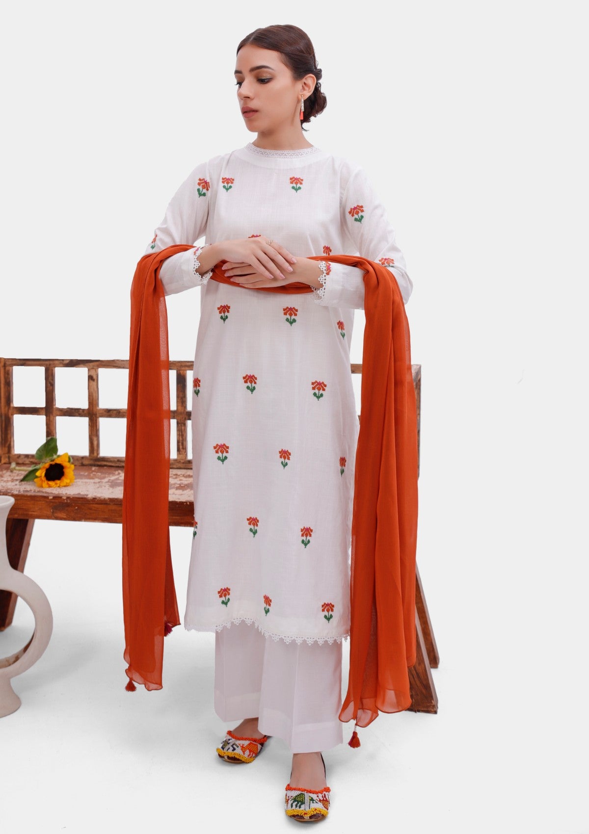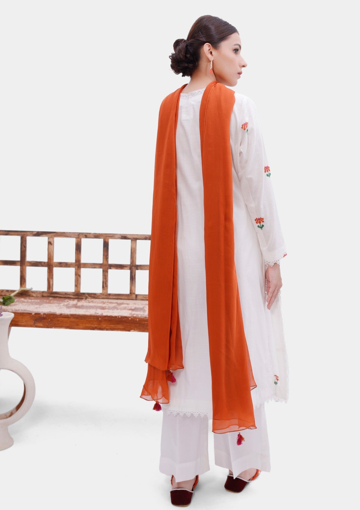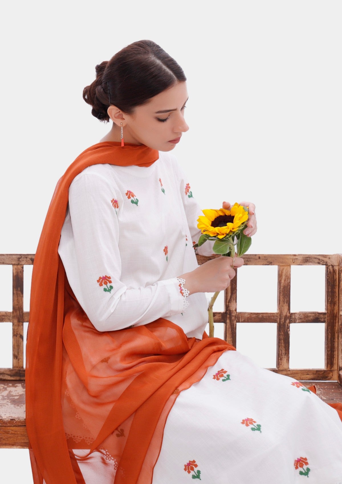 Elevate your style with this creamy off-white attire adorned with delicate pink, rust, and green floral hand embroidery on the shirt, paired with a rust color chiffon dupatta. This ensemble exudes refined elegance, making it a perfect choice for the mid-summer season.