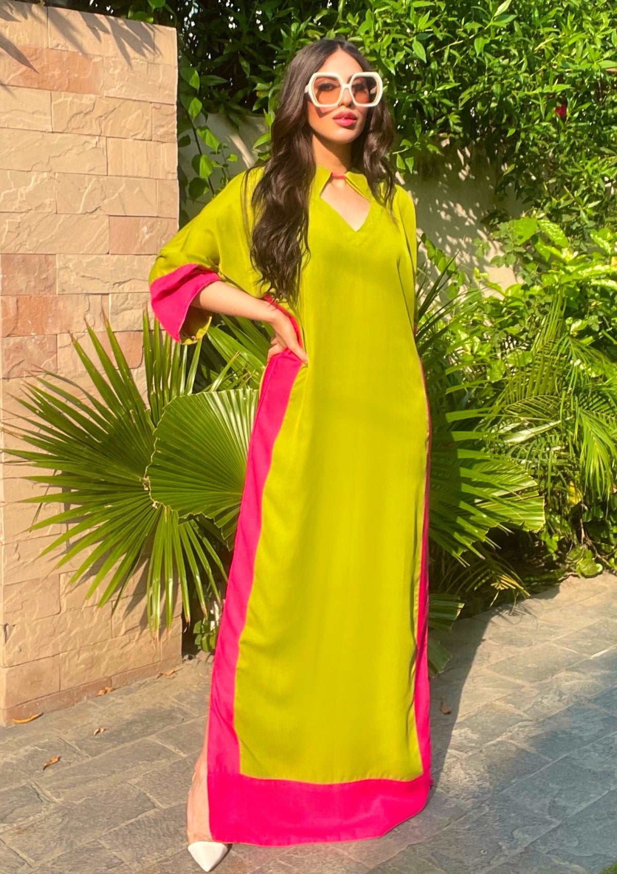 • Green kaftan with pink border