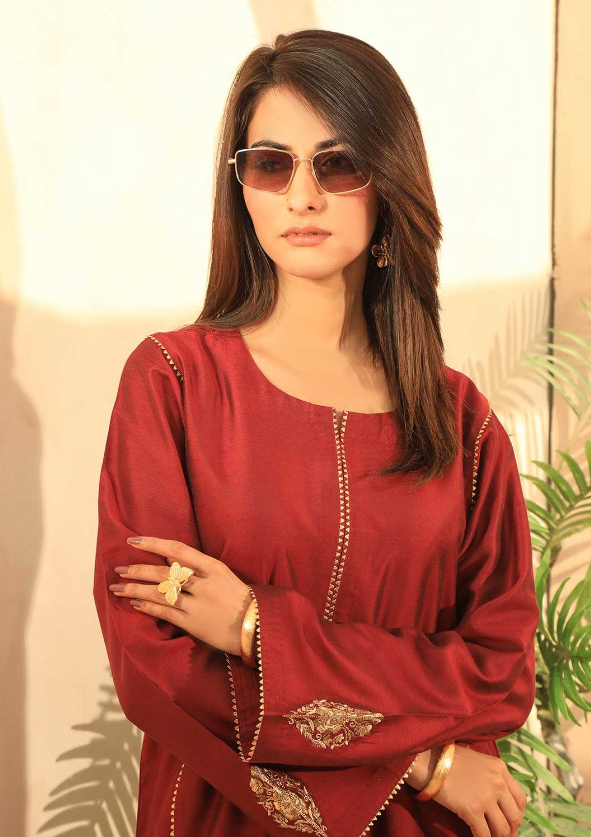 Bold and striking in Deep Red, this two-piece set made from Khaddi Raw Silk is all about making a statement. With intricate embroidery on the neckline, back, and sleeves, and finished with delicate Champa and Gota accents, it brings together confidence and craftsmanship in one sharp, elegant look.