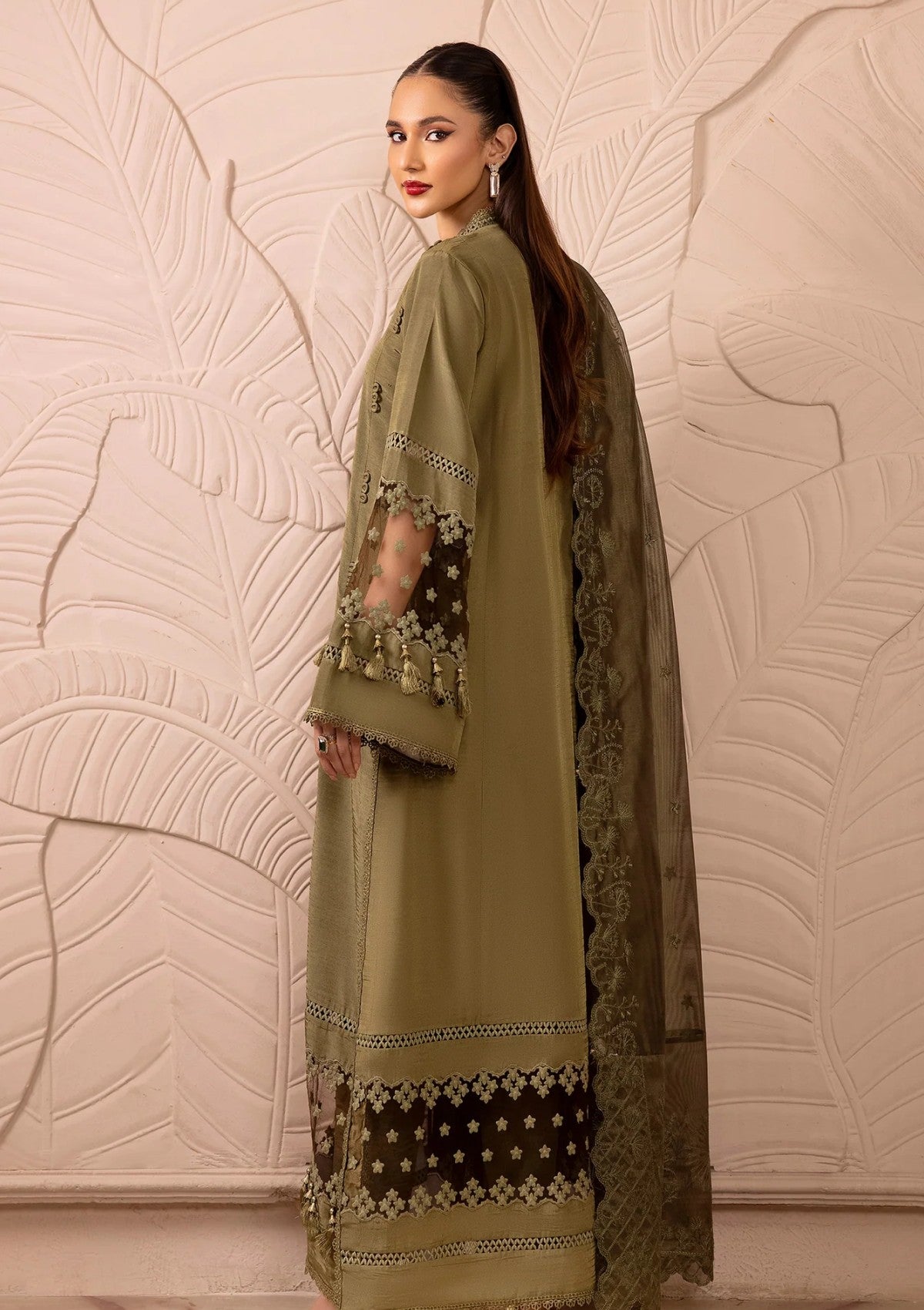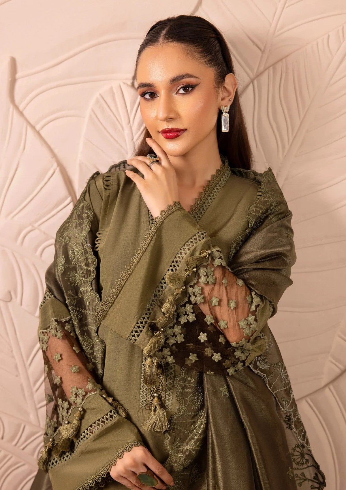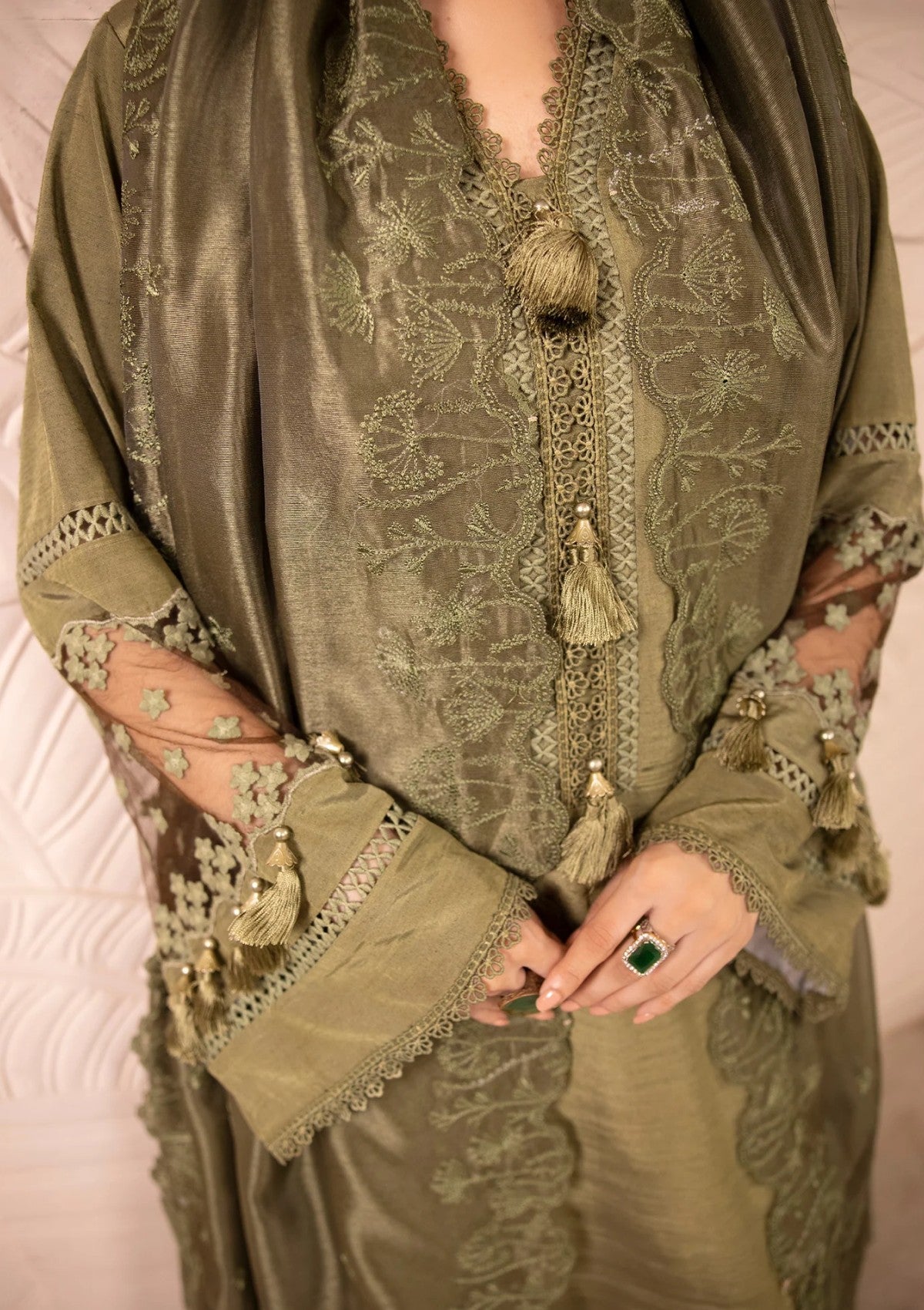 This beautiful olive-green dress is a perfect blend of elegance and tradition, ideal for formal and semi-formal occasions. The long kurta features fine details with a neat, embroidered neckline and playful tassels on the front. The wide bell-shaped sleeves are decorated with delicate embroidery and tassels, while sheer fabric inserts add a touch of grace and style. The hem of the dress is finished with lace and cut-out designs, giving it a refined look