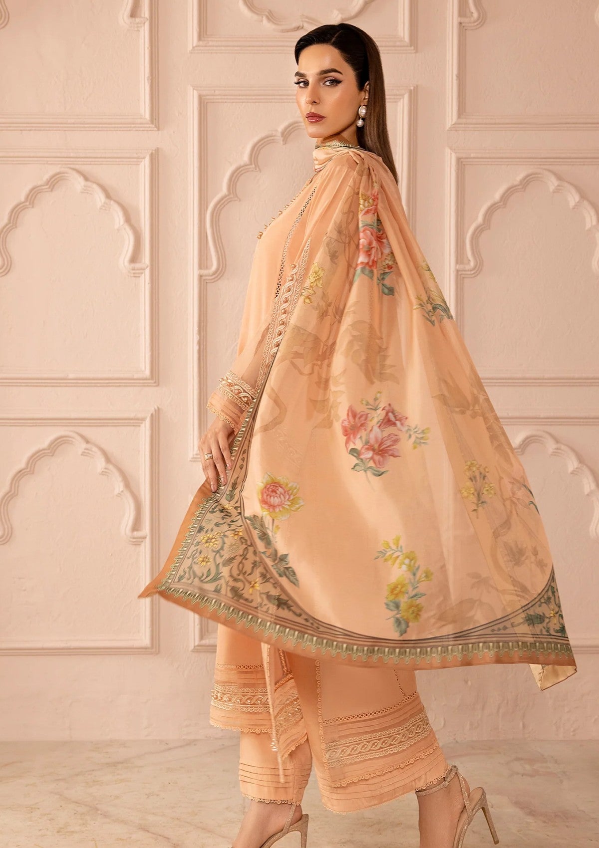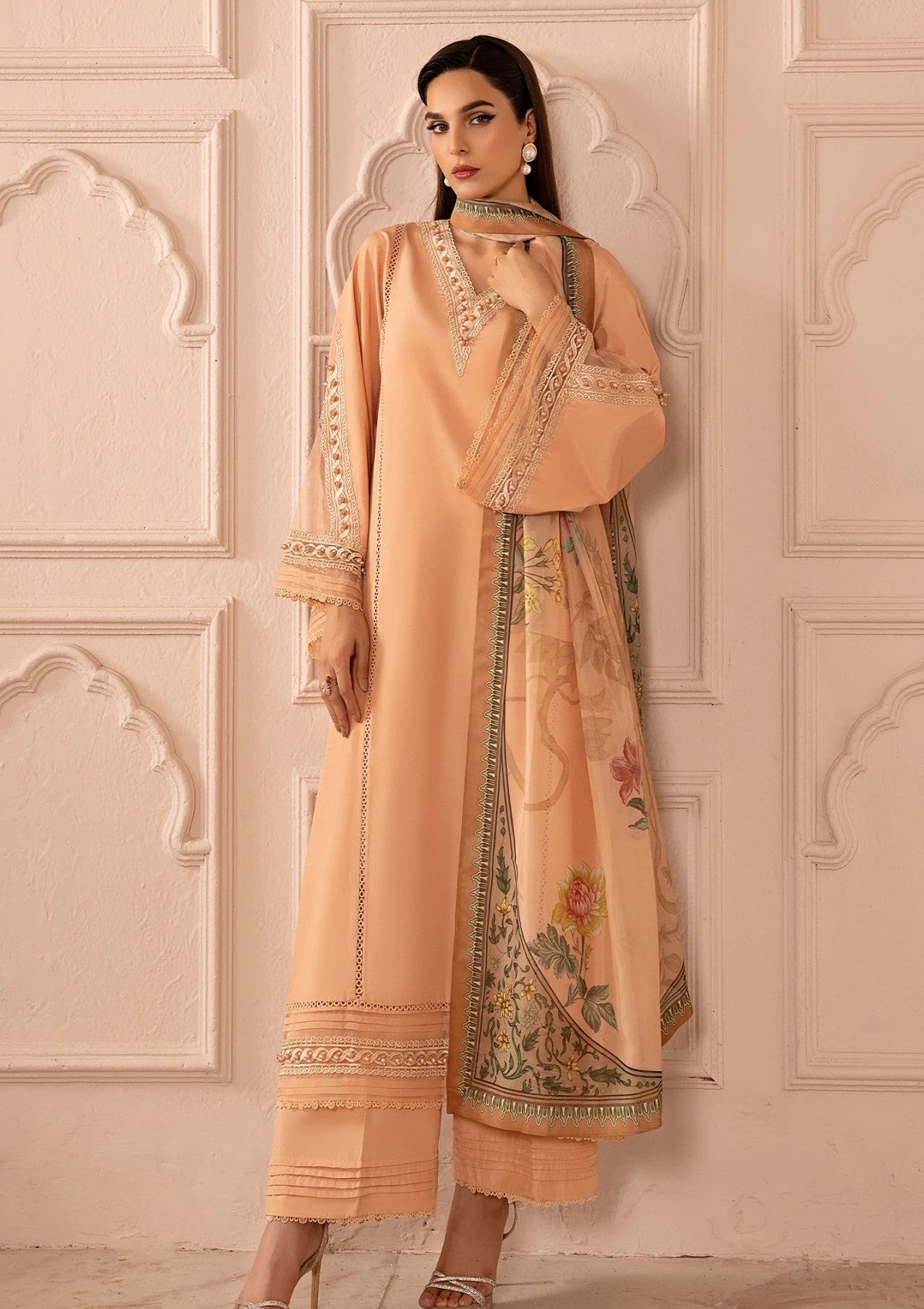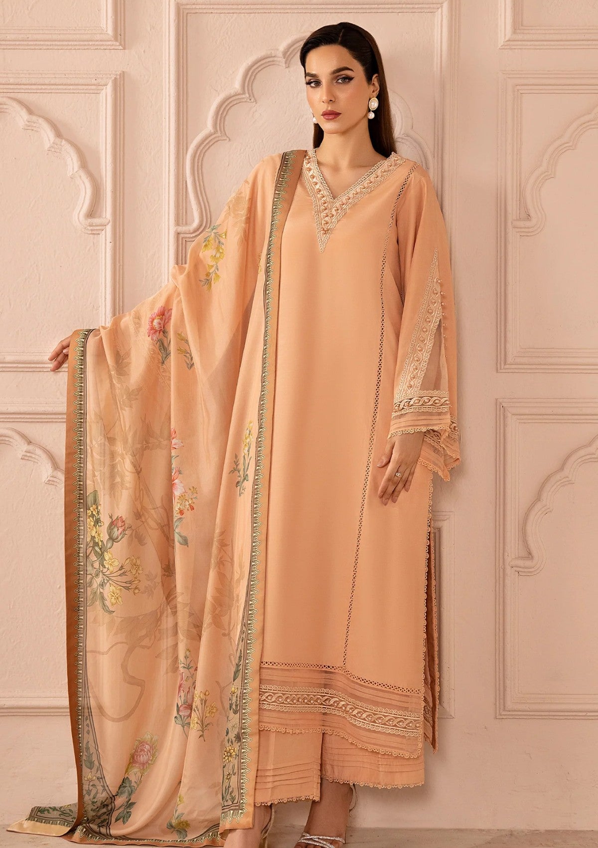 This soft peach-colored outfit is a graceful and elegant choice for formal and semi-formal events. The long kurta is designed with delicate embroidery along the neckline and sleeves, adding a touch of charm. The simple V-neck gives the outfit a classic, timeless look, while the embroidered details at the cuffs and hem elevate the overall style.The matching sheer dupatta features intricate floral patterns, complementing the outfit perfectly and adding a light, feminine touch. The soft flow of the fabric ensures comfort while maintaining a polished and elegant appearance.