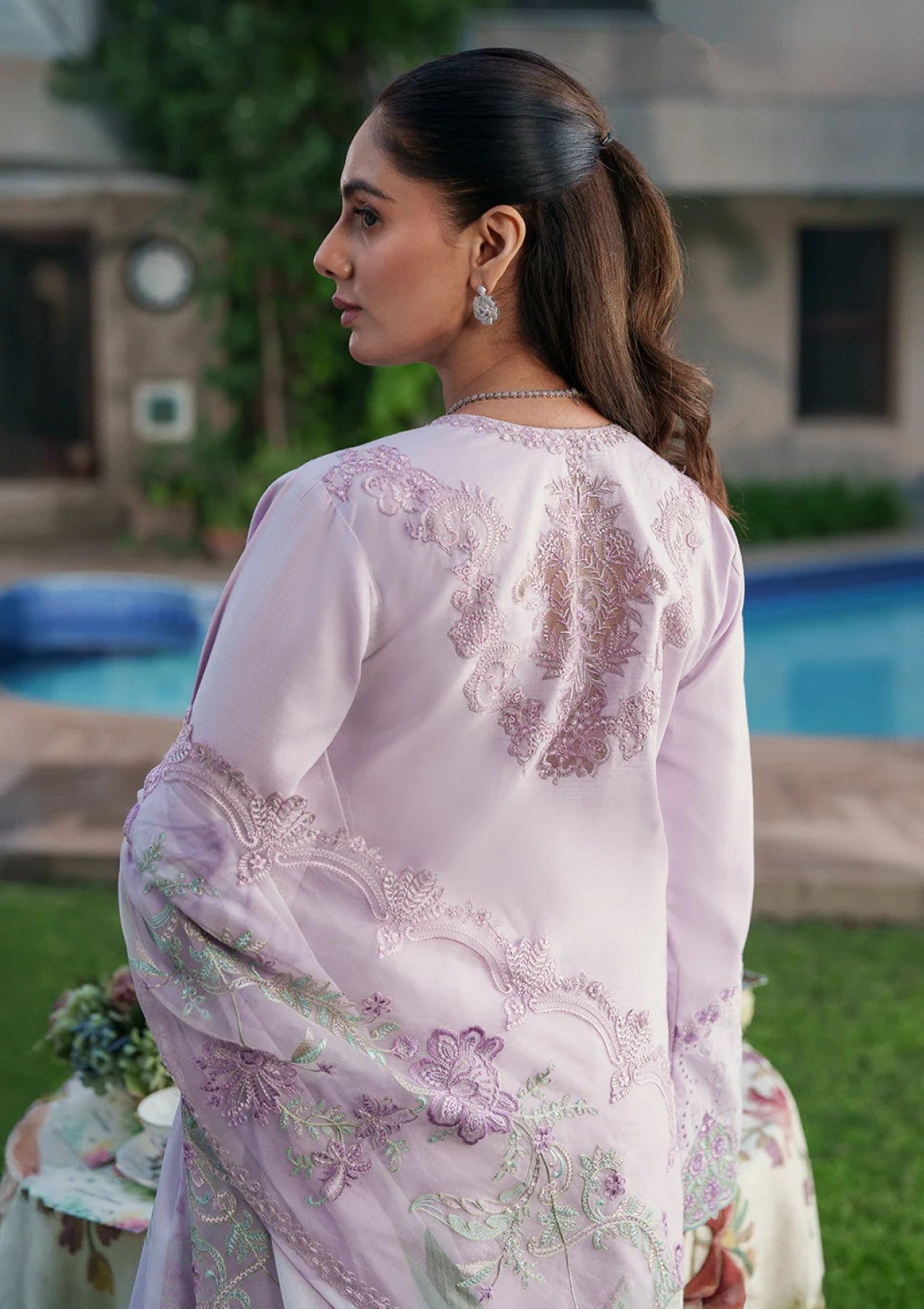 Like a secret garden, delicate flora stretch out on the mesmerizing lilac canvas with hints of ivory, violets, blush and sage, peaking out in perfect harmony in 'AMARA'. The shirt is layered with floral tapestry accentuated by laces and eyelet cotton detailed to perfection, accompanied by intricate borders with embroidery adding an exquisitely unique dimension to the shirt. Can be paired with sumptuously embroidered tonal cotton net heavily embroidered dupatta and our signature lace and embroidery trimmed pants, this design serves as the perfect look to wear to a garden affair.