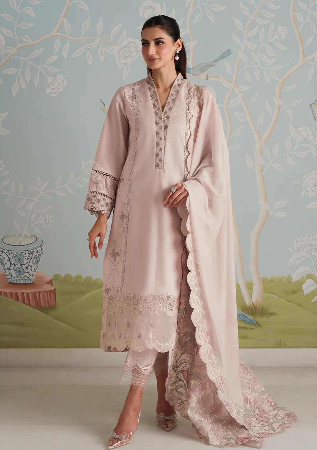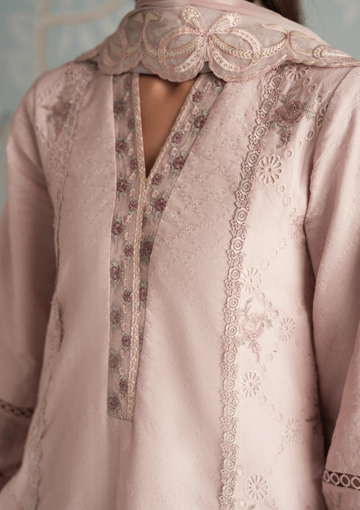 A classically elegant look 'AMBRE’ features a beautifully adorned hemline and sleeves with intricate floral embroidery, cut from a beautiful shade of rose pink self-embroidered lawn, delicately adorned with eyelet panel decorated with hand embellished vintage floral rosettes. The neckline is enhanced with embroidery and delicate lace trimmings further embellished with hand crafted 3D organza flowers. The elegant tunic can be paired with cropped pants highlighted with lace trimmings. Complete the ensemble with a stunning dupatta adorned with an embroidered garland of floral embroidery, this design captures the essence of a vibrant and joyful summer celebration.