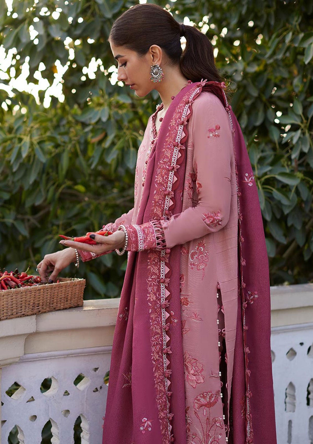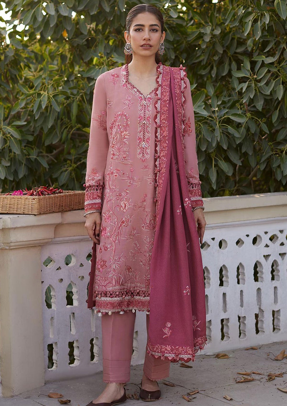 A creamy beige base is artfully illustrated with intricate embroidery depicting flora in bloom to create for a mesmering composition in 'Elma.' Accompanied by a contrasting embroidered shawl rendered in deep salmon, this design makes the perfect look for a garden affair.