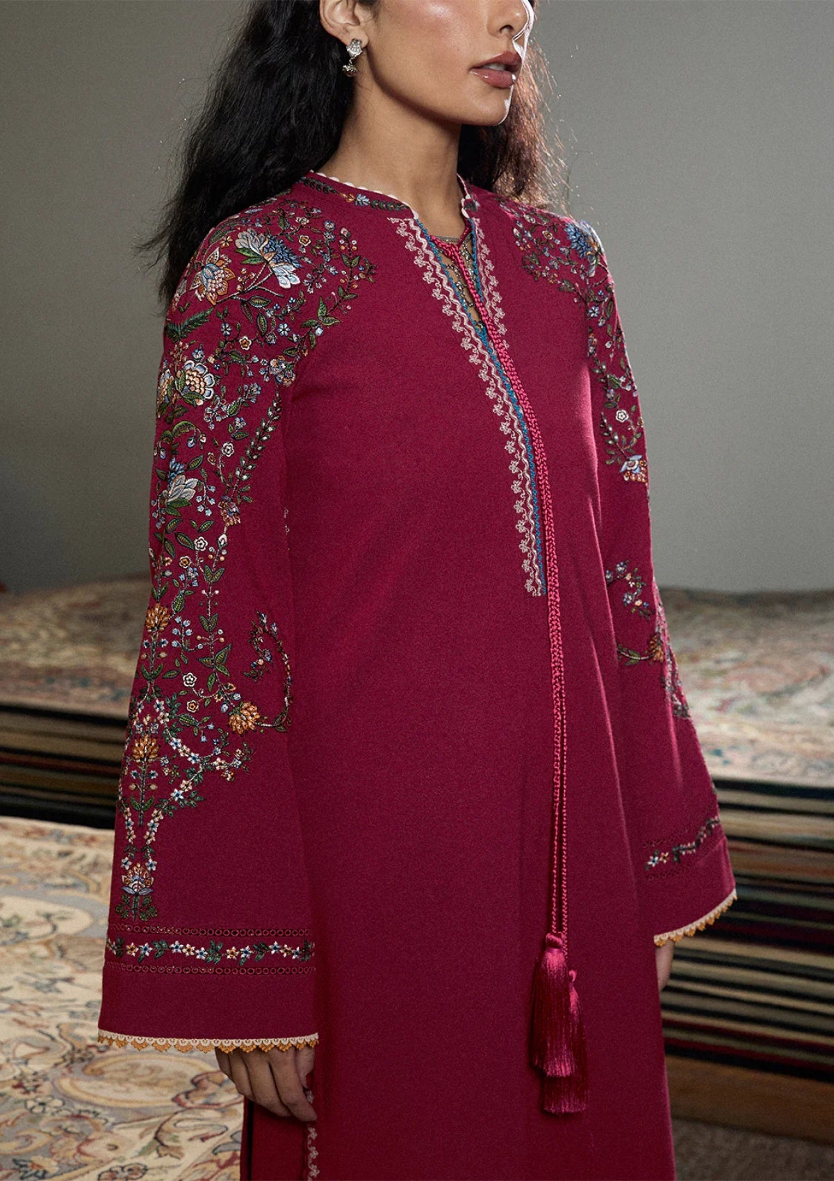 The outfit features a carrot-red shirt adorned with intricate multicolor floral embroidery, radiating traditional elegance. The sleeves echo the same floral motifs, creating a harmonious and refined look, while matching carrot-red shalwar carries the embroidery for a cohesive silhouette. A poly wool printed shawl completes the ensemble, adding texture and a graceful, timeless finish to the traditional attire.