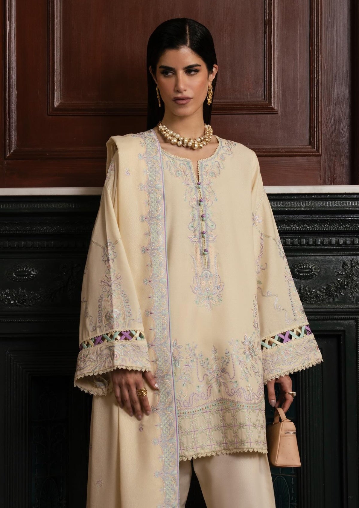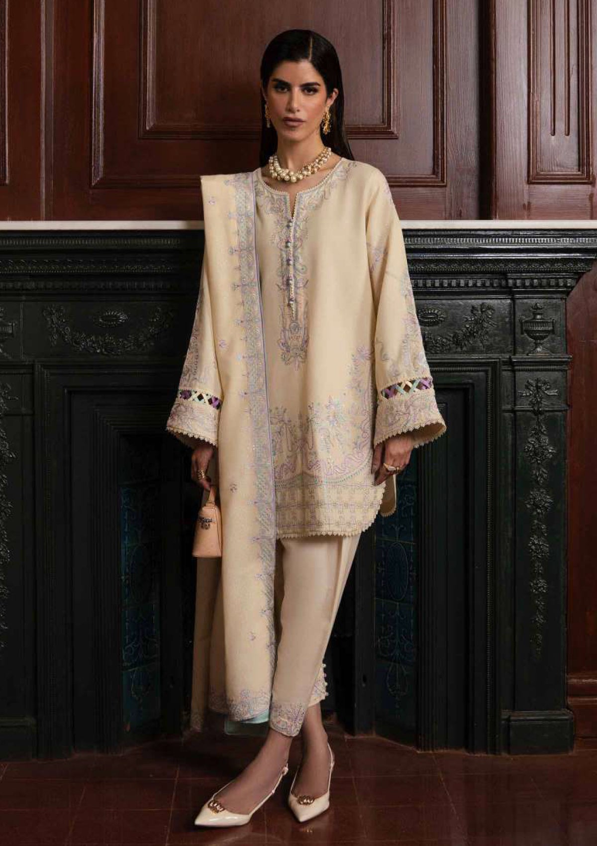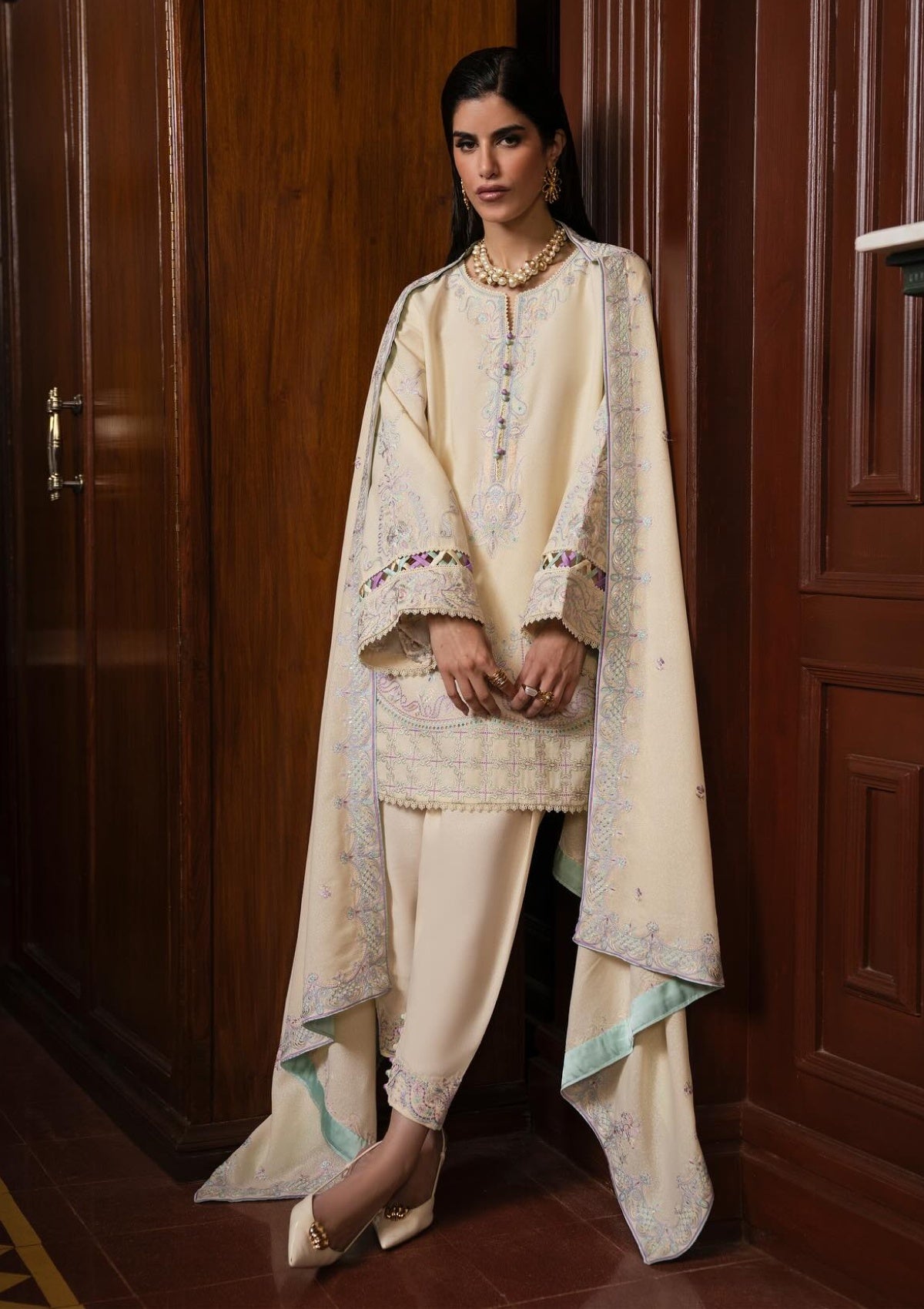 Exude refined grace in this white karandi ensemble, crafted with delicate pastel-colored embroidery that brings a soft, sophisticated charm to its serene base. The short shirt is paired with a traditional embroidered tapered shalwar, blending heritage craftsmanship with contemporary appeal. A colorful karandi embroidered dupatta completes the look, adding vibrance and depth to the understated palette. Perfect for festive gatherings or elegant daytime wear, this outfit radiates effortless poise and femininity.