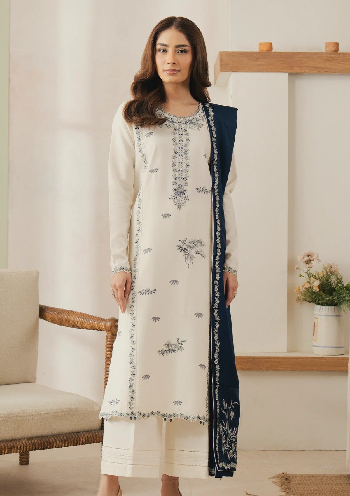 Soft and feminine, Rosayne blooms in a delicate rose-pink hue adorned with intricate embroidery along the neckline, sleeves, and shirt front. Crafted from warm karandi, the unstitched shirt features refined floral motifs in lilac, mauve, and icy blue, with scalloped detailing that adds graceful charm. The matching karandi trouser keeps the look balanced and refined. Completing the ensemble is a deep plum blended embroidered shawl, beautifully finished with statement borders and complementing threadwork — a timeless pairing of elegance, warmth, and winter softness.