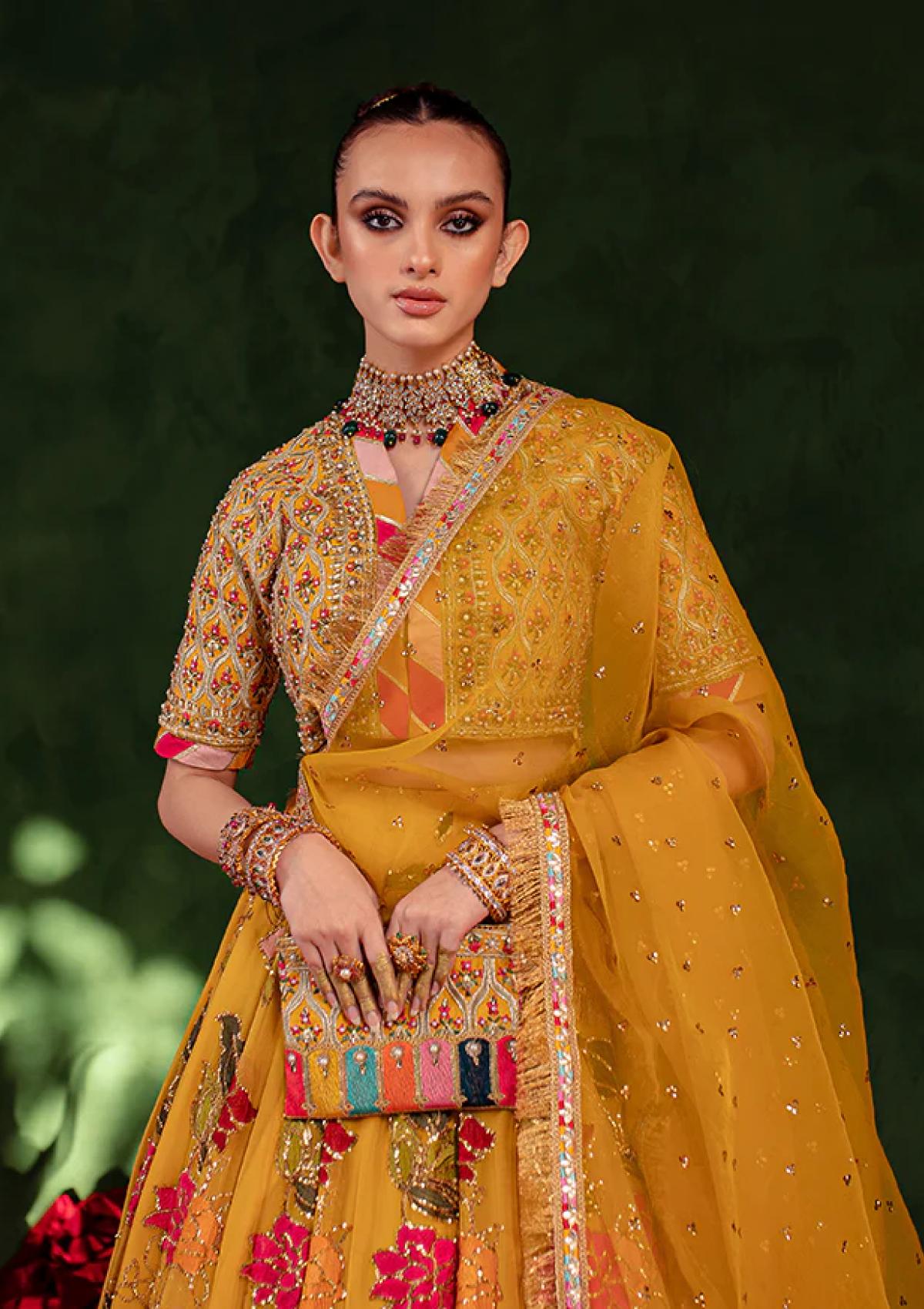 Chambeli is a pefect oufit for mehndi festivities but you can wear it on other occasions as well. Hand embroidered Korean blouse detailed with tilla, resham dori, and tilla is paired with a colorful chiffon lehenga embroidered with thread and sequins work. Complete your look with an organza dupatta embellished with sequins and detailed with kiran.