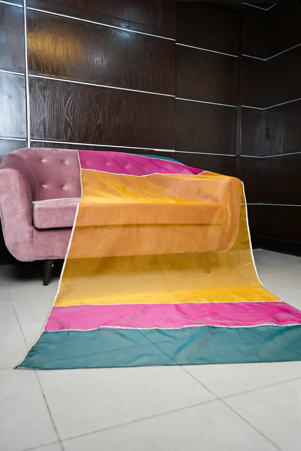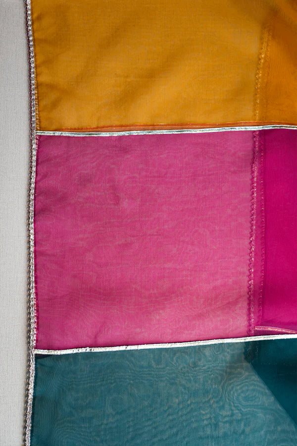Presenting the Vibrant Stripes Dupatta, a striking masterpiece of color and style. Crafted with precision from high-quality organza, this dupatta features three bold and vivacious colors: mustard, vibrant fuchsia pink, and bottle green. Together, they create a vibrant look with an unmistakably bold appearance. These colors unite to form a dynamic and spirited appearance. The outer border of the dupatta is meticulously adorned with golden samosa lace. To emphasize the boldness of the stripes and ensure a clean separation of colors, golden ribbons elegantly intersect each shade. Order now and add a dash of radiance to every occasion.