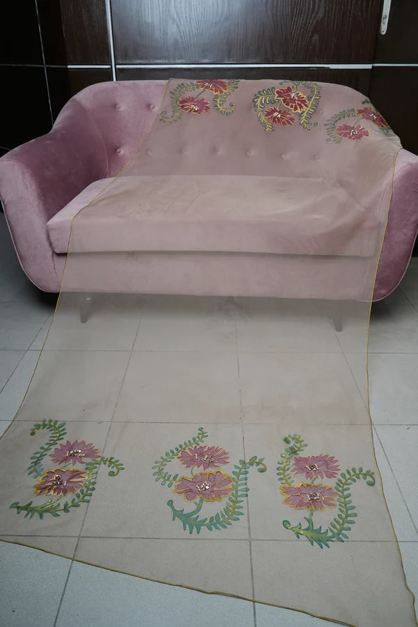 Introducing our Designer Dupatta in an elegant beige hue, featuring a delightful display of red flowers and leaves that intricately adorn the fabric. The subtle warmth of beige provides a versatile backdrop, allowing the vibrant red hues to pop. Enhanced with the subtle glimmer of golden sequins, this dupatta exudes sophistication. The meticulous placement of cream-colored beads adds a touch of timeless charm, making it a perfect accessory to elevate your ensemble with a blend of traditional allure and contemporary style