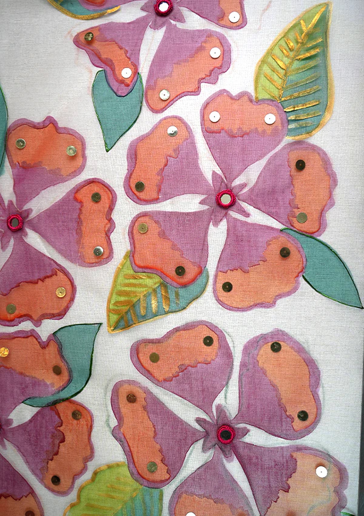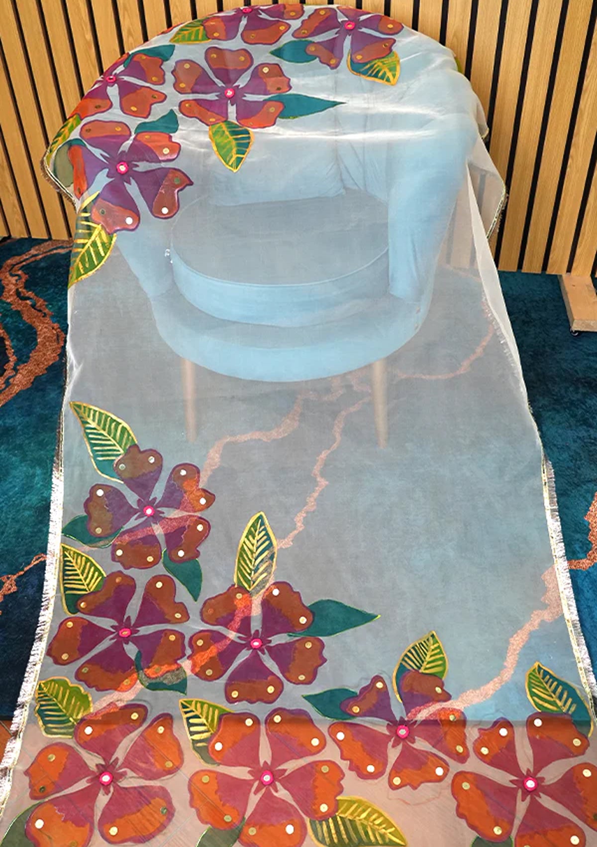 The multi-floral handmade designer dupatta boasts a captivating combination of hues that's both refreshing and elegant. Adorned with pink and orange flowers along with light and dark green leaves, it’s meticulously crafted with fabric paint to add style to the piece. The floral patterns come to life with the addition of golden sequins, Peachy Kiran Lace, and mirrorwork.