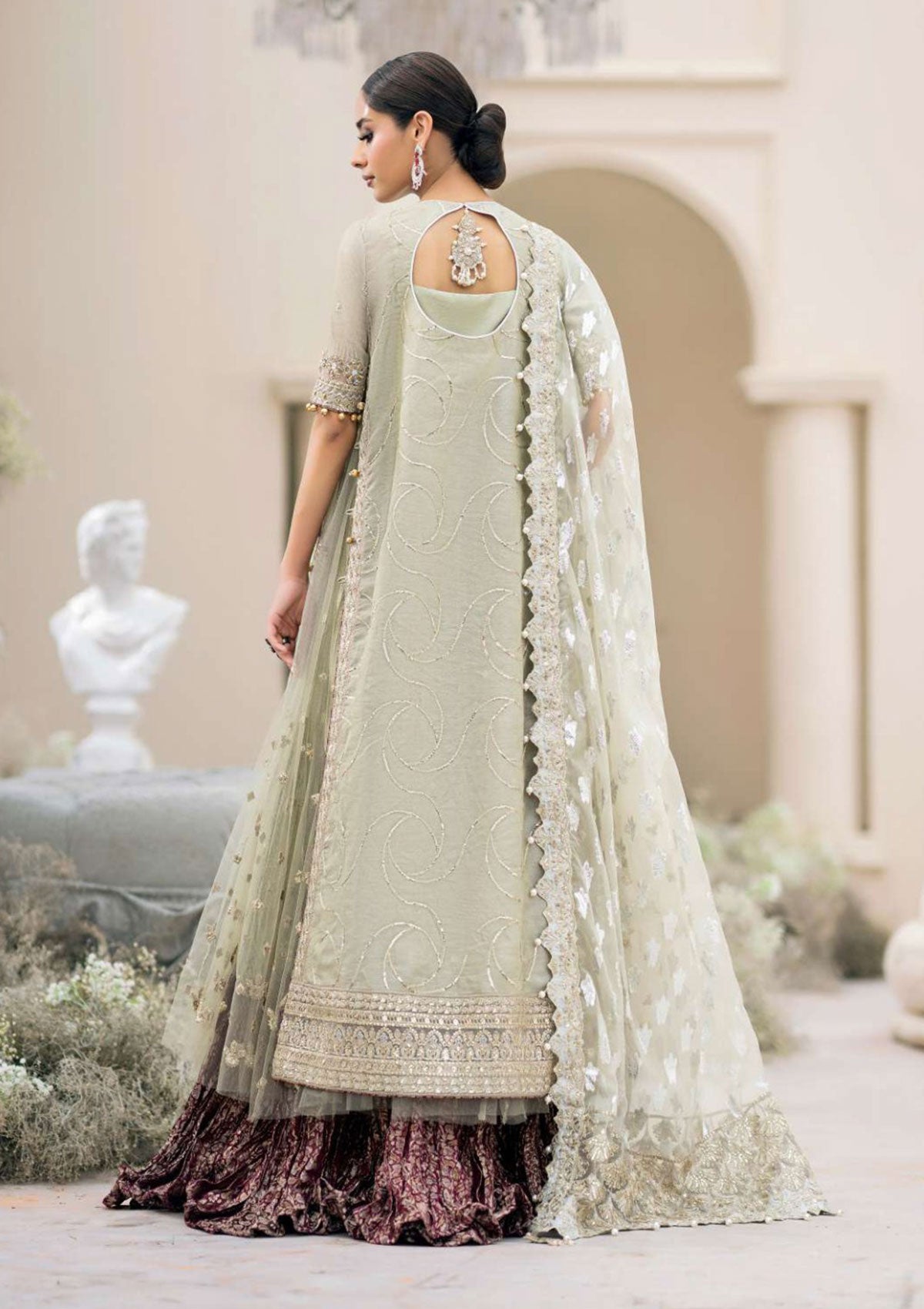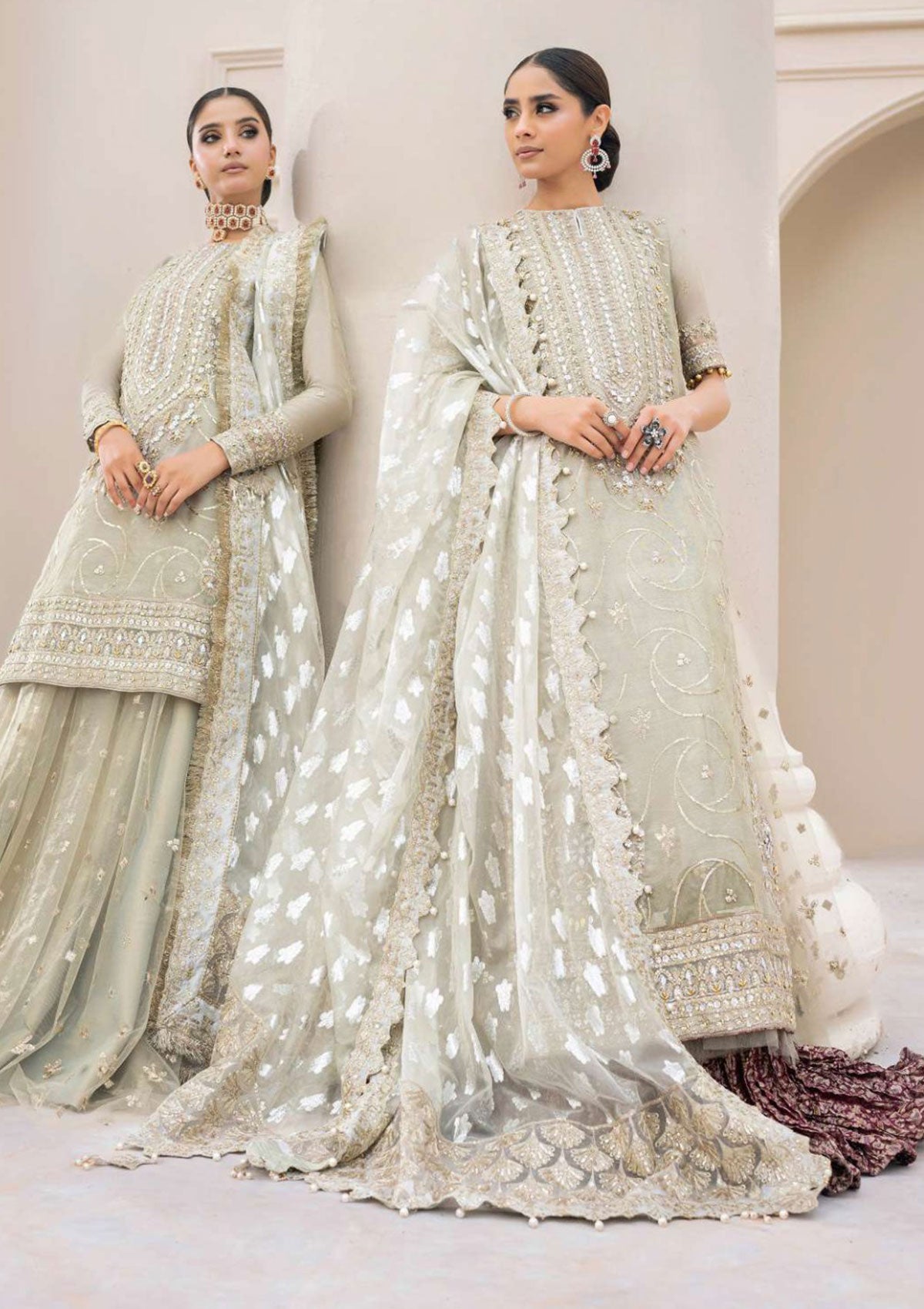 This pearl grey khaadi net design is the epitome of grace. A traditional kameez set with an intricate Ganga-Jamuna neckline adorned with heavy gota work. The hem features ornate motifs inspired by the decorative wall patterns of the Rococo era, in a harmonious composition with the minimal sequin embellished pattern of the kameez. The borders are a tapestry of ornate detailing, creating a luxurious frame that adds a touch of regal elegance to the Look.